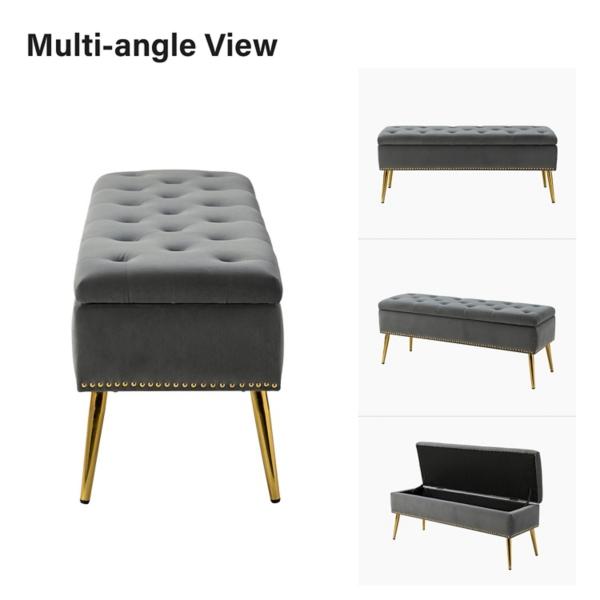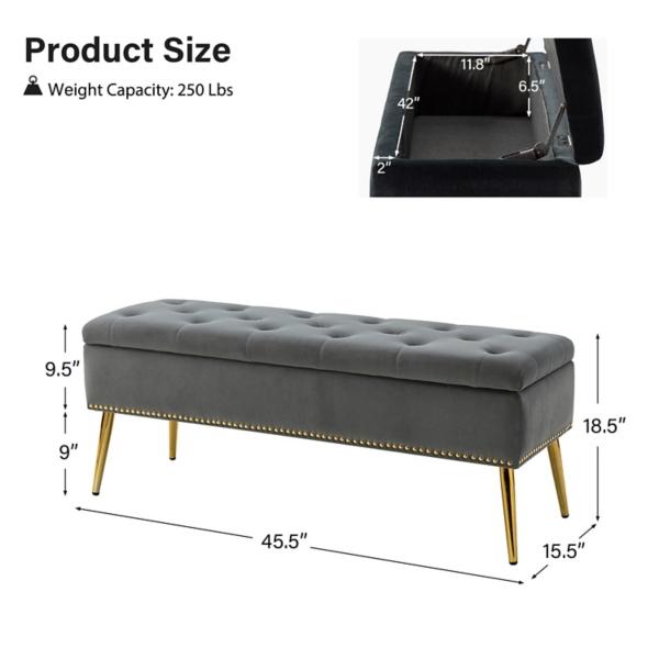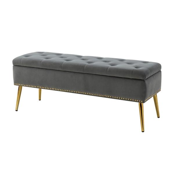 Add a touch of luxury and practicality to your home with this Achilles Gray Tufted Storage Bench! It's ideal for entryways, bedrooms, living rooms, or any space needing extra seating and stylish storage. Bench measures 45.5W x 15.5D x 18.5H in. Crafted with wood and metal frame Upholstered in gray polyester and filled with high-density foam Gold metal leg finish Features interior storage space Tufted fabric design Accented with nailhead trim Storage space measures 42W x 11.8D x 6.5H in. Weight: 25 lbs. Weight capacity: 250 lbs. Assembly required Not intended for commercial use Care: Spot clean. This item is available at Kirklands.com only, not available in stores. Please note: this item cannot be shipped to APO/FPO addresses.