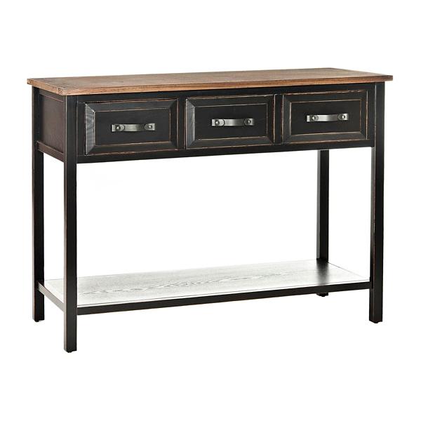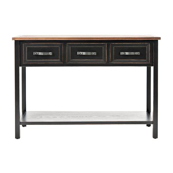 Give your home a touch of old world charm with our Ainsly Distressed Black Oak Top Console Table! Featuring a rich oak-stained top, this piece is a rustic dream. Table measures 42.1L x 15W x 30H in. Crafted of wood Distressed black frame finish with an oak-stained top Includes three (3) drawers and one (1) lower shelf Black hardware features a slight gold brush finish Weight capacity: 50 lbs. Some assembly required Not intended for commercial use Care: Dust with a soft, dry cloth. This item is available at Kirklands.com only, not available in stores. Please note: this item cannot be shipped to APO/FPO addresses. WARNING: This product can expose you to chemicals including wood dust which is known to the state of California to cause cancer and birth defects or other reproductive harm. For more information go to www.P65Warnings.ca.gov.