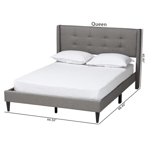 Transform your bedroom with simplicity and elegance! Our Amala Gray Button Tufted Queen Bed Frame features a chic upholstered headboard, making it perfect for a modern home. Overall bed measures 88.4L x 66.5W x 40.9H in. Headboard measures 3.1D x 66.5W x 40.9H in. Crafted with a wood frame Upholstered in 100% polyester fabric and padded with foam Gray finish with black legs Headboard features a button tufted design Accommodates a standard queen mattress; mattress not included Platform design; no box spring needed Assembly required Not intended for commercial use Care: Spot clean only. This item is available at Kirklands.com only, not available in stores. Please note: this item cannot be shipped to APO/FPO addresses. WARNING: This product can expose you to chemicals including formaldehyde and phthalate which are known to the state of California to cause cancer and birth defects or other reproductive harm. For more information go to www.P65Warnings.ca.gov.