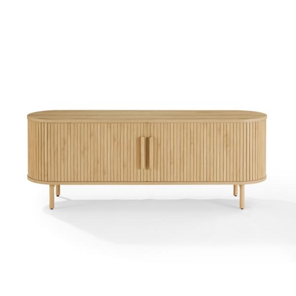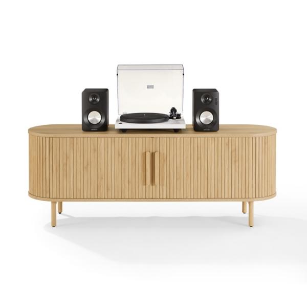 The Ambrose Record Storage Media Console seamlessly blends organic design with modern functionality. Featuring fluted sliding tambour doors and bold wood handles, it makes a striking statement in any space. The media stand has two side cabinets that each hold up to 60 records, along with a center compartment equipped with an adjustable shelf for audio equipment. Tech-ready with dual cable cutouts, this turntable stand with storage is a perfect union of form and function. Overall dimensions Width: 60 in. Depth: 15.75 in. Height: 22.25 in. Crafted of wood Ash wood grain finish Oval shape Sliding tambour doors with a fluted design Large wood L-shaped door handles Center storage cabinet has one adjustable and removable shelf Two side cabinets hold 60 vinyl records each Six removable wire dividers for upright vinyl organization Two pre-cut cable management holes with swivel covers Weight: 64.2 lbs. Side cabinet weight capacity: 35 lbs. each Center storage cabinet weight capacity: 15 lbs. Assembly required Not intended for commercial use Care: Dust with a soft, dry cloth. This item is available at Kirklands.com only, not available in stores. Please note: this item cannot be shipped to APO/FPO addresses.