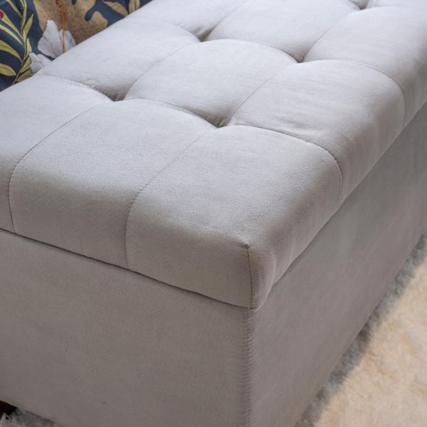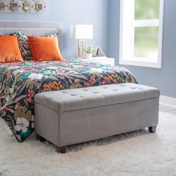 With tufted accents, our Amelia Tufted Gray Shoe Storage Ottoman Bench is the perfect fit for any space and any style! Its square sleek and chic design gives this versatile bench an endless amount of styling options! Bench measures 48L x 20W x 20.5H in. Crafted with a sturdy, wooden frame High-density foam filling Espresso finish legs Upholstered in a gray fabric Features an interior storage compartment that holds up to 20 shoes Button-tufted accents Some assembly required Not intended for commercial use Care: Spot clean only. This item is available at Kirklands.com only, not available in stores. Please note: this item cannot be shipped to APO/FPO addresses.