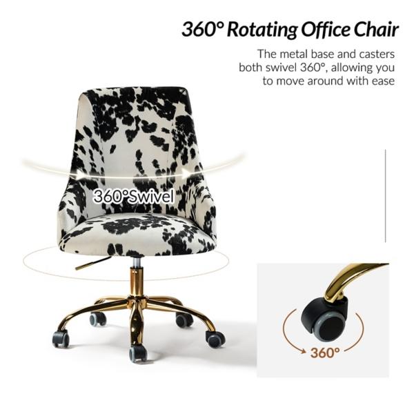 Add a touch of timeless flair to your workspace with this Animal Print Upholstered Arce Office Chair! This chair features a chic pattern and thick cushioning to make your work days comfortable and stylish. Chair measures 21W x 25D x 35.7-37.6H in. Crafted with a wood frame and metal base Upholstered in polyester and filled with high-density foam Gold metal finish Features a 360-degree swivel Adjustable height Animal print fabric pattern Hues of white and black Seat measures 21W x 19.5D x 15.7-17.5H in. Weight: 19.4 lbs. Weight capacity: 250 lbs. Assembly required Not intended for commercial use Care: Wipe with a soft, dry cloth. This item is available at Kirklands.com only, not available in stores. Please note: this item cannot be shipped to APO/FPO addresses.