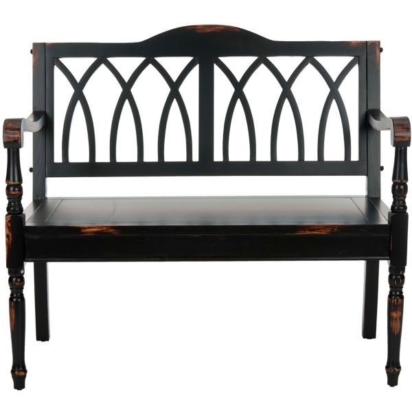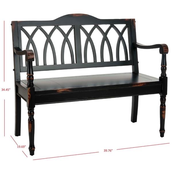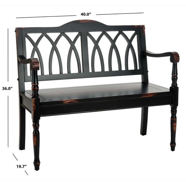 This Antique Black Wood Mandy Traditional Bench is a striking statement appropriate for any interior. This bench features elegant finials on the sides and arms with a back motif inspired by Gothic architecture. Bench measures 40W x 19.7D x 36H in.; seat height: 17.13 in. Crafted of pine wood Distressed black finish Features an arch cut-out backrest design Turned legs Weight: 33 lbs. Weight capacity: 550 lbs. Assembly required; see Info & Guides in the drop down below to view or print assembly info Not intended for commercial use Care: Wipe with a soft, dry cloth. This item is available at Kirklands.com only, not available in stores. Please note: this item cannot be shipped to APO/FPO addresses.