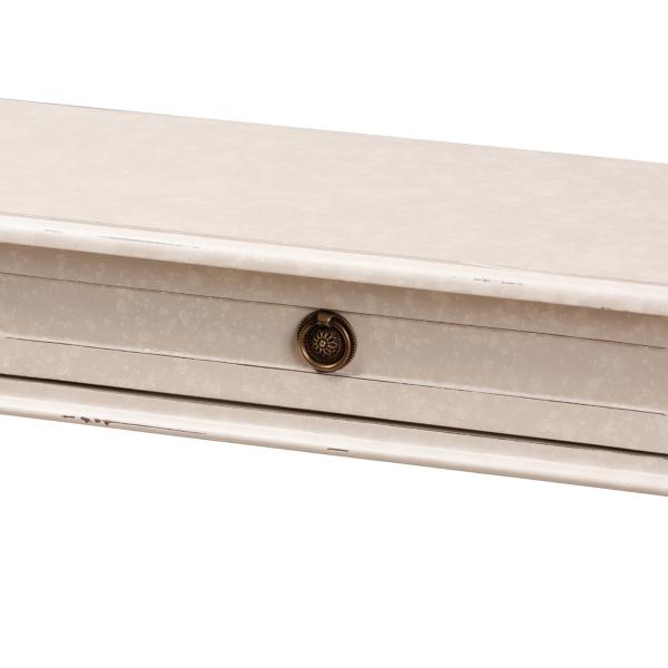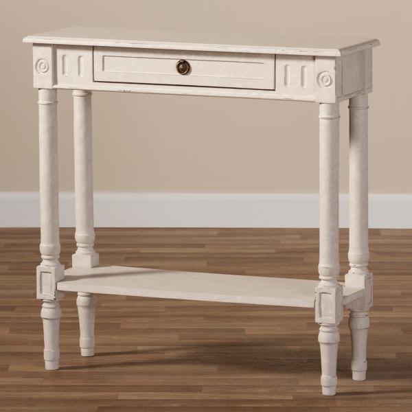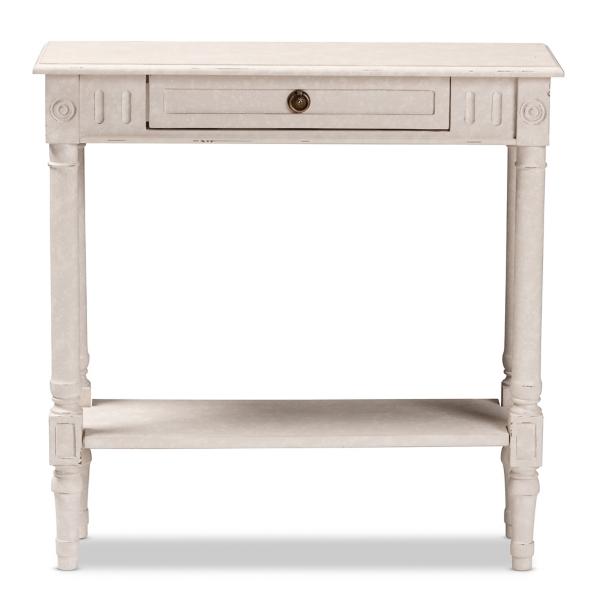 Add charm to your entryway with this Arielle Whitewash Farmhouse Console Table! This country cottage-inspired console table features ornate details in a whitewash finish to elevate your home. Console table measures 31.5W x 9.84D x 31.5H in. Crafted of wood Whitewash finish Features one (1) drawer and one (1) lower shelf Ornate ball turned leg design Dark bronze finished drawer pulls Weight: 24 lbs. Assembly required Not intended for commercial use Care: Wipe with a soft, dry cloth. This item is available at Kirklands.com only, not available in stores. Please note: this item cannot be shipped to APO/FPO addresses.