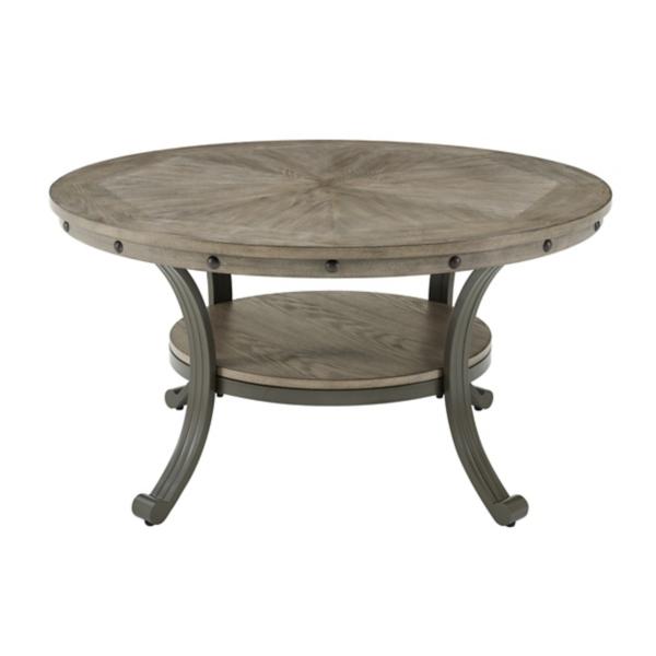 The best way to bring your living room to life is with the perfect piece of furniture! Our Ash Gray Round Nailhead Coffee Table features a decorative inlay tabletop that’s sure to set the tone of your space. Coffee table measures 19H x 36 in. in diameter Crafted with a metal frame and wood composite surfaces Pewter frame finish with ash gray stained wood Tabletop features an inlay pattern Apron accented with nailhead details Includes a lower shelf Legs include floor protecting leveling pads Weight capacity: 100 lbs. Some assembly required; see Info & Guides below to view or print assembly instructions. Not intended for commercial use Care: Wipe with a soft, damp cloth. Not safe for outdoor use. This item is available at Kirklands.com only, not available in stores. Please note: this item cannot be shipped to APO/FPO addresses. WARNING: This product can expose you to chemicals including DEHP which is known to the state of California to cause cancer and birth defects or other reproductive harm. For more information go to www.P65Warnings.ca.gov.