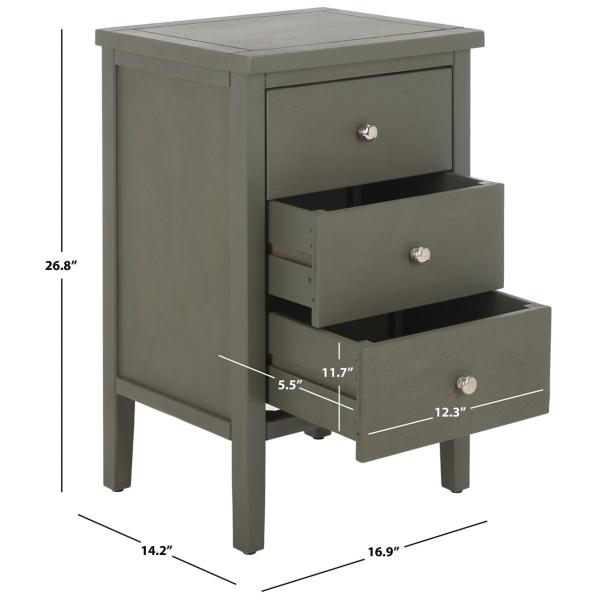 Get organized in style with the Ash Gray Wood 3-Drawer Denise End Table. Featuring three roomy drawers, this table coordinates with any decor while storing any items with French country flair. End table measures 17W x 14.2D x 26.8H in. Crafted of wood Ash gray finish Features three (3) drawers Silver metal drawer pulls Drawers measure 12.3W x 5.5D x 11.7H in. Weight: 23 lbs. Weight capacity: 45 lbs. No assembly required Not intended for commercial use Care: Wipe with a soft, dry cloth. This item is available at Kirklands.com only, not available in stores. Please note: this item cannot be shipped to APO/FPO addresses.