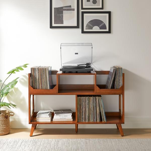 This Asheville Walnut Record Player Stand offers stylish storage for vinyl lovers! Your turntable takes center stage while a crate-style bin keeps your albums conveniently organized. This stand keeps you organized and ready to drop the needle whenever the mood hits. Console table measures 47W x 16D x 31H in. Crafted of MDF, rubberwood, and wood veneer Rich walnut finish The top of the console can be used as a record player stand Top shelf features two (2) crate-style record storage bins; holds up to 65 records each Lower shelf holds up to 220 records Features an audio component storage shelf Tapered legs with adjustable levelers Weight: 60 lbs. Audio shelf weight capacity: 20 lbs. Top shelf record storage weight capacity: 35 lbs. each Lower shelf weight capacity: 110 lbs. Assembly required Not intended for commercial use Care: Dust with a soft, dry cloth. This item is available at Kirklands.com only, not available in stores. Please note: this item cannot be shipped to APO/FPO addresses.