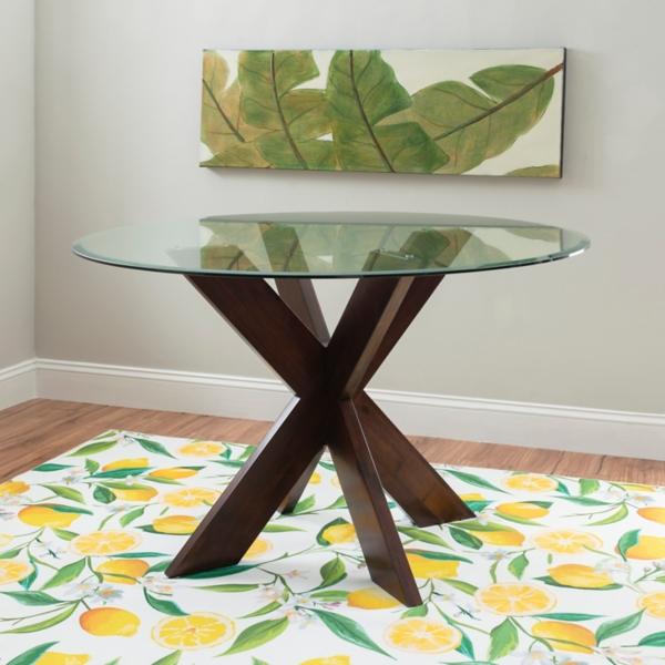 A bold intersection of sculptural lightness and industrial strength, this Auden Glass and Espresso Wood Round Dining Table makes a dramatic statement in any modern setting. Anchoring the design is a pedestal X-base of acacia, finished in a dark brown stain that leans into a modern feel. Table measures 30H x 48 in. in diameter Crafted with an acacia wood and hardwood base Espresso wood finish Round shape Features a beveled tempered glass tabletop Scratch-resistant glass Pedestal X-base design Seats up to four (4) people Weight: 85 lbs. Weight capacity: 100 lbs. Some basic assembly required Not intended for commercial use Care: Dust with a soft, dry cloth.