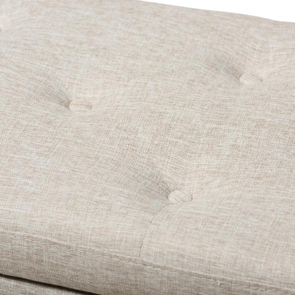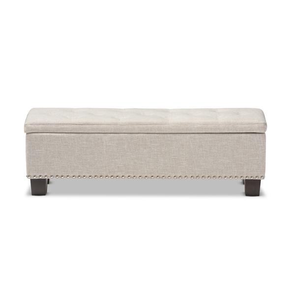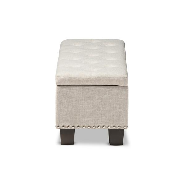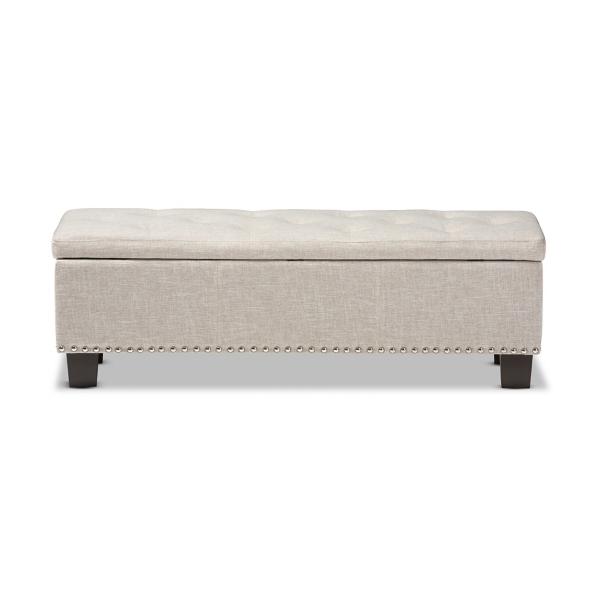 Fashion and function come together beautifully with our Beige Button-Tufted Upholstered Storage Bench. You'll love the spacious storage compartment and lovely detailing. Bench measures 52.17L x 16.73W x 17.32H in.; Seat height measures 17.32H in. Crafted with a wooden frame Black leg finish Upholstered in 100% polyester beige fabric Features button tufted detailing Features nailhead accents Features storage compartment Weight: 49.82 lbs. Some assembly required Weight capacity: 190 lbs. Not intended for commercial use Care: Spot clean only. This item is available at Kirklands.com only, not available in stores. Please note: this item cannot be shipped to APO/FPO addresses. WARNING: Cancer and Reproductive Harm - For more information go to www.P65Warnings.ca.gov.