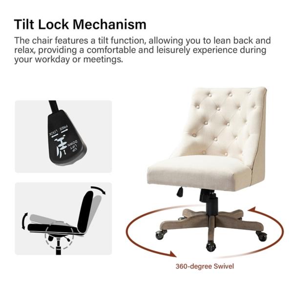 Elevate your office space with this elegant Beige Upholstered Jovita Office Chair! Featuring a stylish design, this chair also offers supreme comfort thanks to its ergonomic shape and with soft filling. Chair measures 23W x 25.5D x 34.5-38.5H in. Crafted with a wood frame and wood and metal base Upholstered in beige polyester and filled with high-density foam Vintage wood finish Features a 360-degree swivel Adjustable height Tufted backrest Tilt lock mechanism Seat measures 23W x 18.5D x 17.5-21.5H in. Weight: 32 lbs. Weight capacity: 250 lbs. Assembly required Not intended for commercial use Care: Wipe with a soft, dry cloth. This item is available at Kirklands.com only, not available in stores. Please note: this item cannot be shipped to APO/FPO addresses.