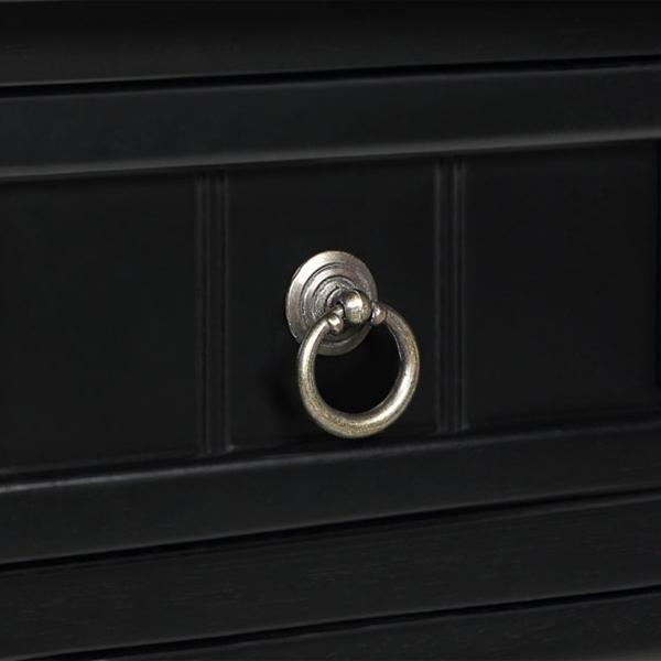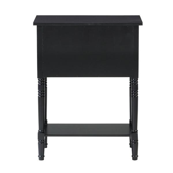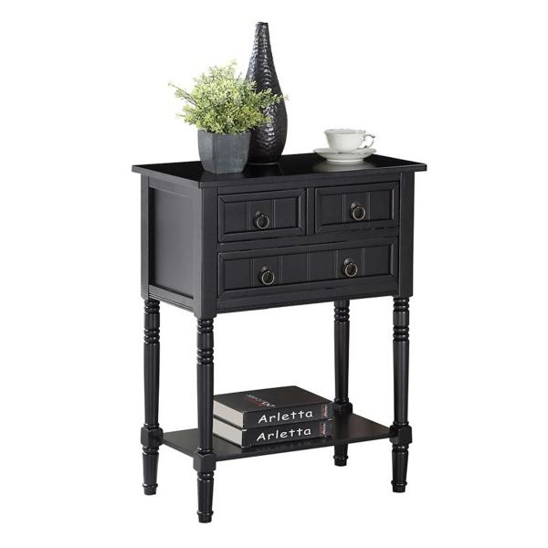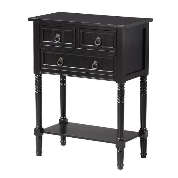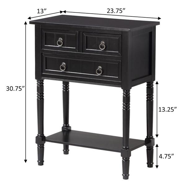 From your entryway to your bedroom, this stylish Black 3-Drawer Turned Legs Accent Table has the perfect amount of storage space! You'll love the look of the traditional accents while it keeps your space organized. Accent table measures 23.75W x 13D x 30.75H in. Crafted of solid wood and MDF Black finish Features three (3) drawers and one (1) lower shelf Accented with turned legs and shaker drawers Weight: 28 lbs. Weight capacity: 40 lbs. Easy assembly required Not intended for commercial use Care: Wipe with a soft, dry cloth. This item is available at Kirklands.com only, not available in stores. Please note: this item cannot be shipped to APO/FPO addresses.