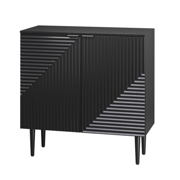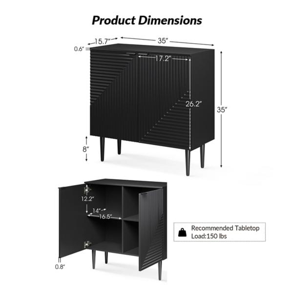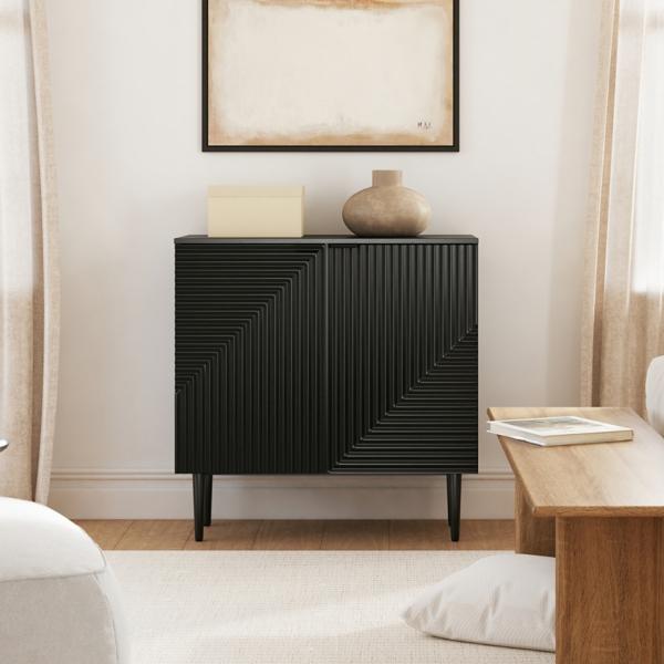 Elevate your space with this sleek and contemporary Black Burkart 2-Door Cabinet! Inside, generous storage space makes it perfect for organizing essentials, whether in your living room, hallway, or bedroom. Cabinet measures 35W x 15.7D x 35H in. Crafted of manufactured wood and metal Black finish Features geometric door fronts Adjustable interior shelves Weight: 67 lbs. Weight capacity: 150 Assembly required Not intended for commercial use Care: Wipe with a soft, dry cloth. This item is available at Kirklands.com only, not available in stores. Please note: this item cannot be shipped to APO/FPO addresses.