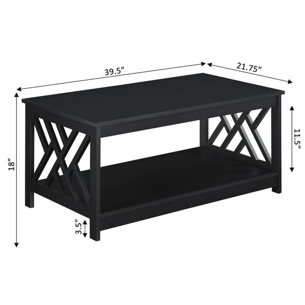 Modernize your living space with this Black Cut-Out Sides Coffee Table! The geometric cut-out panels make this table perfect for displaying décor from any angle. Coffee table measures 39.5W x 21.75D x 18H in. Crafted of MDF and particle board Black finish Features one lower shelf Accented with geometric cut-out side panels Weight: 38 lbs. Weight capacity: 40 lbs. Easy assembly required Not intended for commercial use Care: Wipe with a soft, dry cloth. This item is available at Kirklands.com only, not available in stores. Please note: this item cannot be shipped to APO/FPO addresses.
