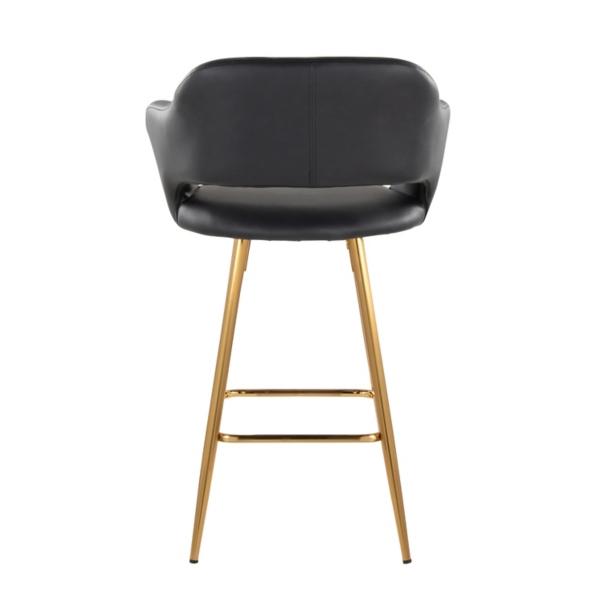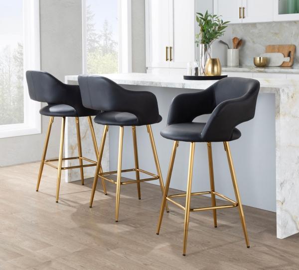 Upgrade your kitchen space with these Black Faux Leather Marge Counter Stools! These sleek stools feature sophisticated faux leather upholstery and contemporary silhouettes. They're perfect for elevating your home! Set includes two (2) counter stools Each stool measures 23.5W x 23.5D x 38.25H in.; seat height: 25.25 in. Crafted with a metal frame Upholstered in black faux leather with high-density foam Gold metal finish Features open, low backrests Slim armrests Built-in footrests Weight capacity: 250 lbs. Assembly required; see Info & Guides in the drop down below to view or print assembly instructions Not intended for commercial use Care: Wipe with a soft, damp cloth. This item is available at Kirklands.com only, not available in stores. Please note: this item cannot be shipped to APO/FPO addresses.