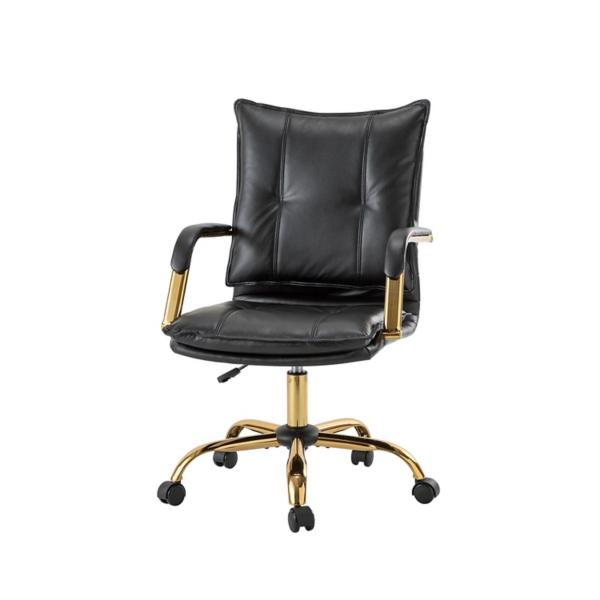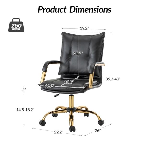 Add a touch of chic flair to your workspace with this Black Faux Leather Riccardo Office Chair! This chair features refined tufting, comfortable padding, and gold finishes to bring character and elegance to any office. Chair measures 22.2W x 26D x 36.3-40H in. Crafted with a wood frame and metal base Upholstered in black faux leather and filled with high-density foam Gold metal finish Features a 360-degree swivel with 5 durable casters Adjustable height Tufted backrest Padded armrests Seat measures 19.2W x 20.5D x 14.5-18.2H in. Weight: 26 lbs. Weight capacity: 250 lbs. Assembly required Not intended for commercial use Care: Wipe with a soft, dry cloth. This item is available at Kirklands.com only, not available in stores. Please note: this item cannot be shipped to APO/FPO addresses.