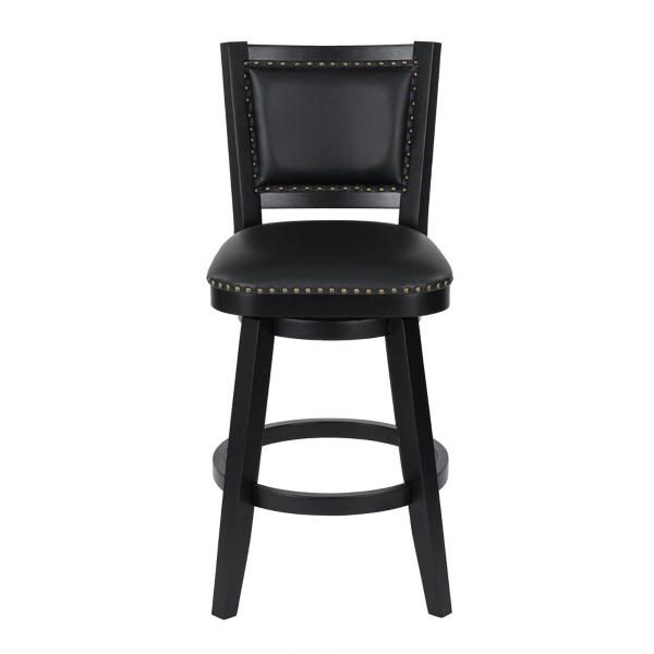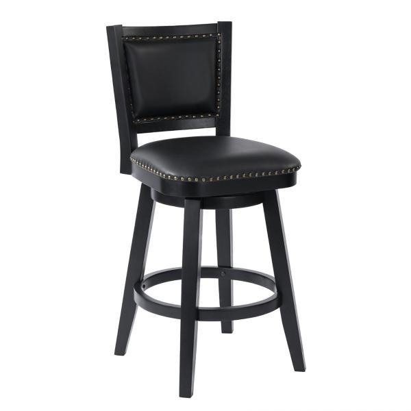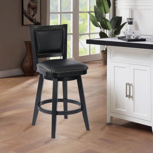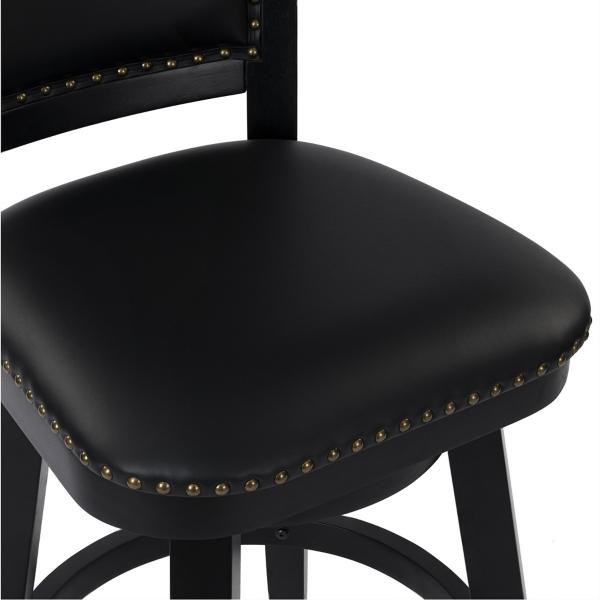 Reimagine your space with this Black Faux Leather Swivel Broadmoor Bar Stool! This bar stool is both comfortable and stylish, making it perfect for upgrading your kitchen or bar area. Bar stool measures 25.25W x 22D x 44H in.; seat height: 29.75 in. Crafted of rubberwood Upholstered in black faux leather and filled with high-density foam Black wood finish Features 360 degree swivel capability Accented with nailhead trim Protective floor glides Weight: 35.5 lbs. Weight capacity: 300 lbs. Assembly required Not intended for commercial use Care: Wipe with a damp or dry cloth. This item is available at Kirklands.com only, not available in stores. Please note: this item cannot be shipped to APO/FPO addresses.