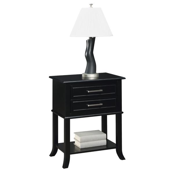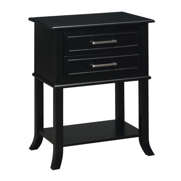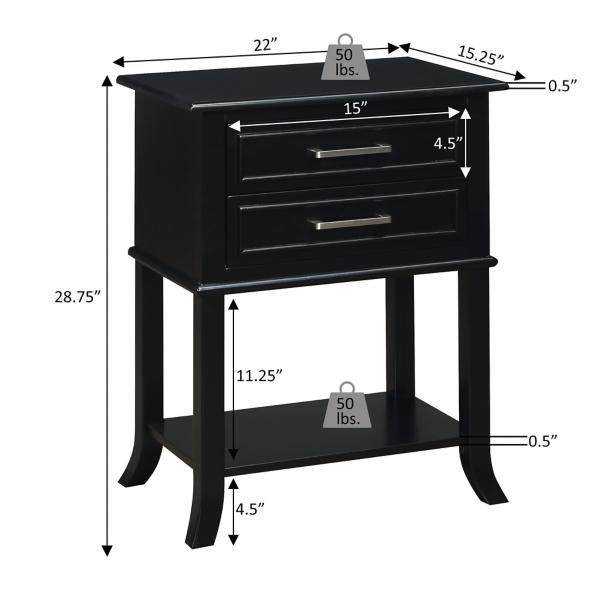 Deliver elegance to your night time routine with the refined look of our Black Flared Two-Drawer Accent Table. With its shelf and two drawers, this table will add lots of storage space to your bedside! Table measures 22L x 15.25W x 28.75H in. Crafted of solid wood, engineered wood, and metal Black wood finish Features two (2) pull out drawers and one (1) open bottom shelf Drawers have a molded design and silver hardware Solid wood, flared legs Beveled edge tabletop Rectangle shape Weight: 36 lbs. Shelf weight capacity: 30 lbs. Assembly required Not intended for commercial use Care: Dust with a soft, dry cloth. This item is available at Kirklands.com only, not available in stores. Please note: this item cannot be shipped to APO/FPO addresses.