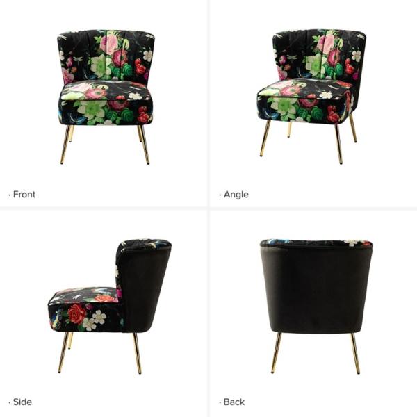 This Black Floral Amata Accent Chair features luxurious upholstery complemented by vertical tufting and a colorful floral pattern! It offers supreme comfort thanks to its ergonomic shape and durable frame with soft filling. Chair measures 26W x 30D x 31H in. Crafted with a wood frame and metal legs Upholstered in polyester and filled with high-density foam Gold metal leg finish Features a vertical tufted backrest Curved ergonomic shape Floral fabric pattern Hues of black, green, pink, yellow, red, white, and blue Seat measures 22W x 21D x 18H in. Weight: 21 lbs. Weight capacity: 250 lbs. Assembly required Not intended for commercial use Care: Spot clean. This item is available at Kirklands.com only, not available in stores. Please note: this item cannot be shipped to APO/FPO addresses.