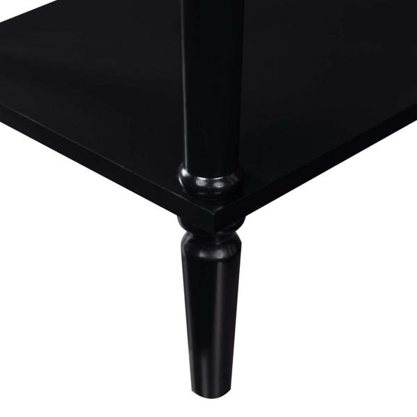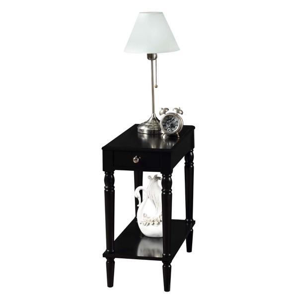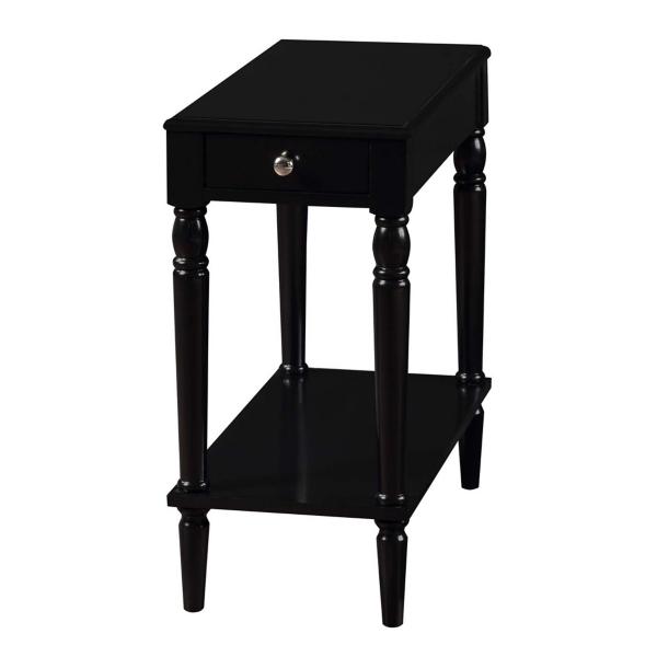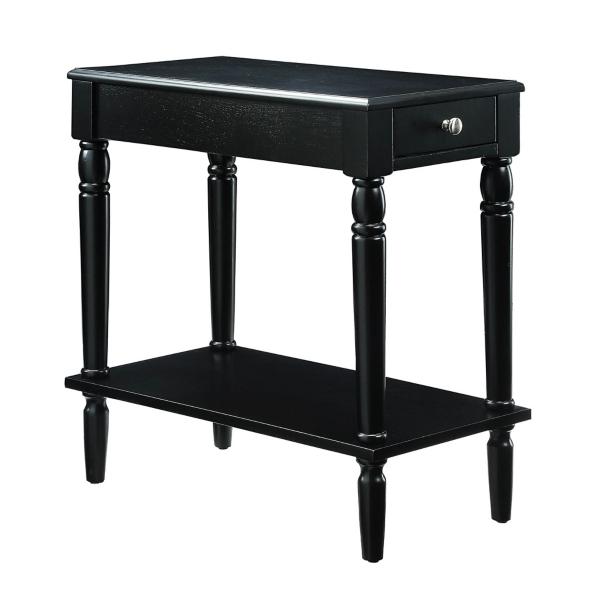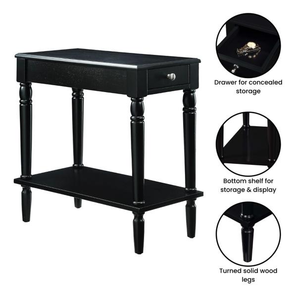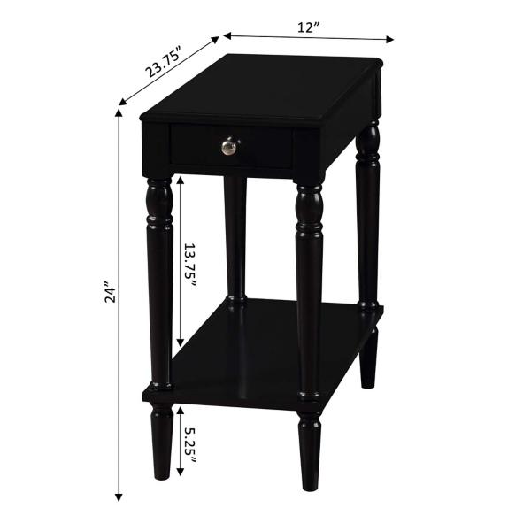 Featuring storage space and classically beautiful details, this Black French Country Single Drawer Accent Table will make a stylish and functional addition to any space! Its sleek, dark finish is an ideal base for decor and easily complements any furniture. Overall dimensions Width: 23.5" Depth: 11.75" Height: 24" Crafted of wood composite, rubberwood, and birch veneer Black finish Features one (1) drawer and one (1) lower shelf Turned legs Silver drawer handle Weight capacity: 18 lbs. Shelf weight capacity: 20 lbs. Assembly required; no tools needed Not intended for commercial use Color may vary slightly due to photography lighting or monitor display Care: Dust with a soft, dry cloth. This item is available at Kirklands.com only, not available in stores. Please note: this item cannot be shipped to APO/FPO addresses.