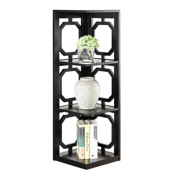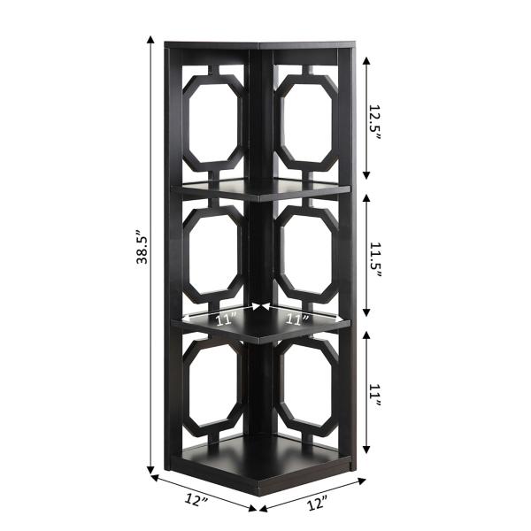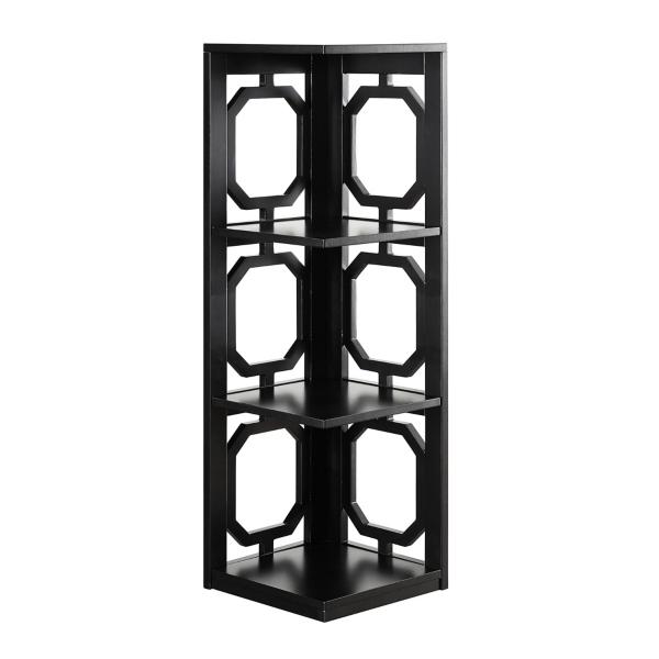 Turn any unused corner into a stylish focal point with this Black Geometric 3-Tier Corner Shelf! Designed to blend elegance with practicality, this three-tier shelving unit is perfect for showcasing your favorite décor while saving space. Bookcase measures 12W x 12D x 38.5H in. Crafted of MDF Black finish Features three (3) tiers of shelving Geometric cut-outs Corner design Weight: 16 lbs. Weight capacity: 4.4 lbs. per shelf Assembly required Not intended for commercial use Care: Wipe with a soft, dry cloth. This item is available at Kirklands.com only, not available in stores. Please note: this item cannot be shipped to APO/FPO addresses.