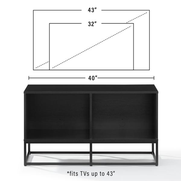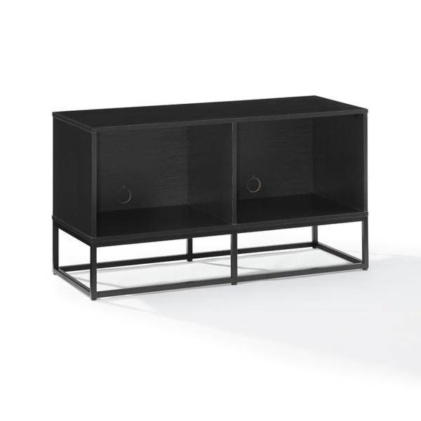 Set the stage for your favorite music with the Black Record Storage Media Console! This cabinet features open shelving tailored for vinyl storage. Its clean and simple design will add a modern edge to your space! Console measures 40L x 15.75W x 22.25H in. Crafted of metal and engineered wood Black finish Features two (2) sections sized to fit full-size 12-inch records Each storage shelf has a pre-cut cable management hole Weight capacity: 100 lbs. Assembly required Care: Dust with a soft, dry cloth. This item is available at Kirklands.com only, not available in stores. Please note: this item cannot be shipped to APO/FPO addresses. WARNING: This product can expose you to chemicals including wood dust and lead, which are known to the state of California to cause cancer and birth defects or other reproductive harm. For more information go to www.P65Warnings.ca.gov.