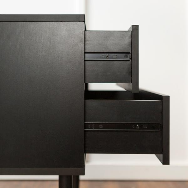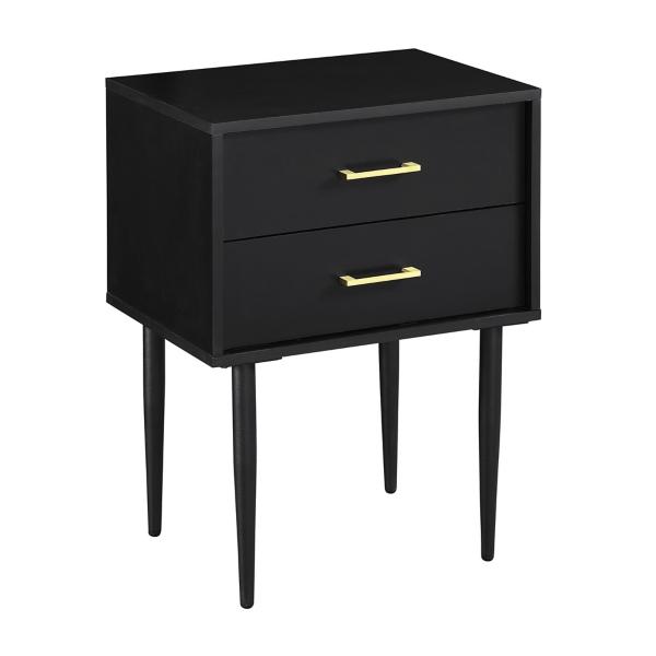Our Black Mid-Century Modern Accent Table offers a sleek finish with golden hardware that will stun in your minimalist décor. Whether it's set bedside or sofa adjacent, this simple boxed design will help organize your clutter and complement your mid-century modern home! Table measures 20L x 15W x 26H in. Crafted of durable laminate, powder-coated metal, and warp-resistant wood composite Black finish Features two (2) pullout drawers Gold handle hardware Full assembly required Not intended for commercial use Care: Dust with a soft, dry cloth. This item is available at Kirklands.com only, not available in stores. Please note: this item cannot be shipped to APO/FPO addresses.