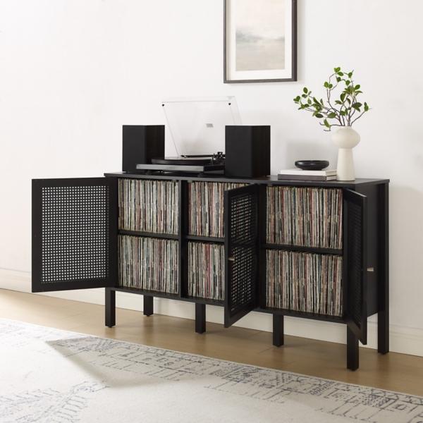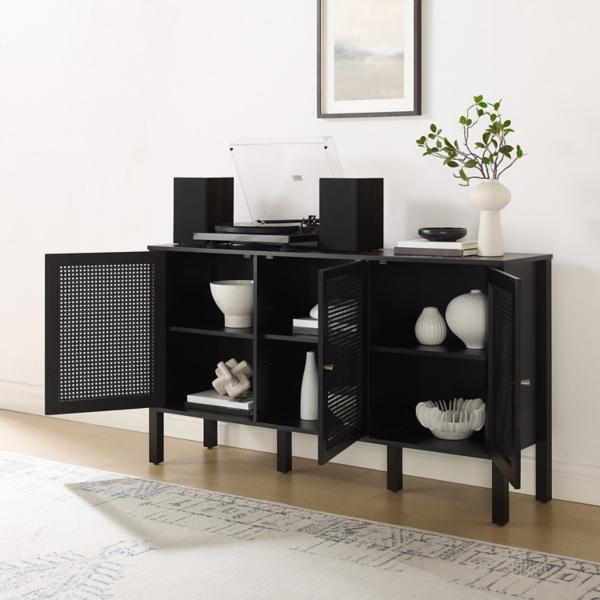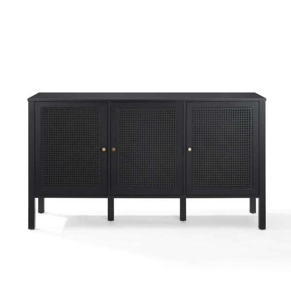 Our Black Modern Perry Cabinet will make a fantastic storage solution! Its roomy interior and hidden shelves are perfect for organizing your home in a sleek modern way! Overall dimensions Width: 55 in. Depth: 14 in. Height: 31.5 in. Crafted of natural wood Black finish Gold metal handle finish Features three (3) storage cabinets with magnetic closures Includes adjustable shelves in each cabinet Three (3) pre-cut cable management holes with swivel covers Cabinet doors have poly-rattan mesh panels Shelf weight capacity: 15 lbs. each Weight: 64 lbs. Assembly required Not intended for commercial use Care: Dust with a soft, dry cloth. This item is available at Kirklands.com only, not available in stores. Please note: this item cannot be shipped to APO/FPO addresses.