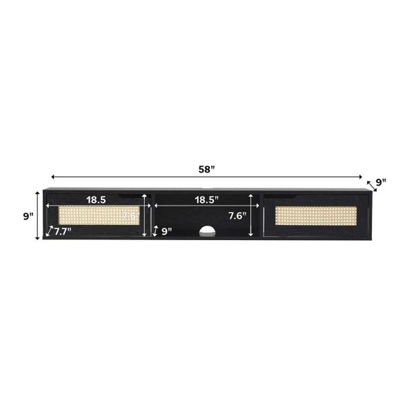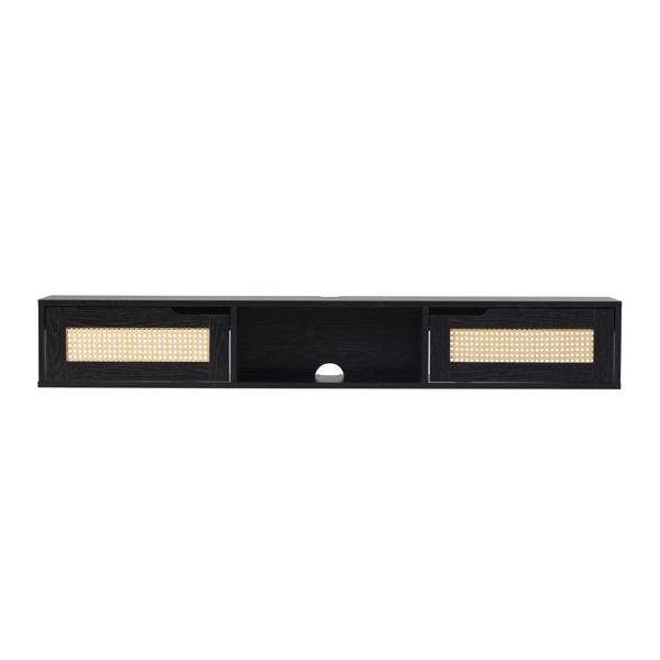 Elevate your space with this sleek Black Modern Rattan Floating TV Stand! This TV stand features a contemporary look and compact design, perfect for upgrading small spaces. TV stand measures 58W x 9D x 8.75H in. Crafted of warp-resistant MDF, laminate, and faux rattan Black finish Features two (2) fold-down doors with rattan insets Open and concealed storage Accommodates most TVs up to 65 in. Cut-outs for cord management Middle shelf measures 18.5 W x 9D x 7.6H in. Weight: 30 lbs. Weight capacity: 60 lbs. Assembly required; see Info & Guides in the drop down below to view or print assembly info Not intended for commercial use Care: Wipe with a soft, dry cloth. This item is available at Kirklands.com only, not available in stores. Please note: this item cannot be shipped to APO/FPO addresses.