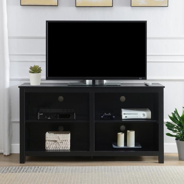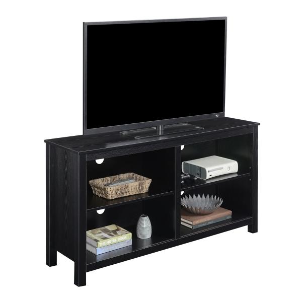 Set up the entertainment center of your dreams with this Black Montana 4-Shelf Media Cabinet. Featuring ample storage and cord management holes, it provides the space to keep all your gadgets organized! Table measures 58L x 15.75W x 30H in. Crafted of wood composite and melamine Black finish Features two (2) adjustable shelves, two (2) fixed shelves, and four (4) cable management holes Accommodates a TV up to 65 in. wide Weight: 72 lbs. Shelf weight capacity: 20 lbs. Assembly required Not intended for commercial use Care: Dust with a soft, dry cloth. This item is available at Kirklands.com only, not available in stores. Please note: this item cannot be shipped to APO/FPO addresses.