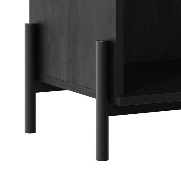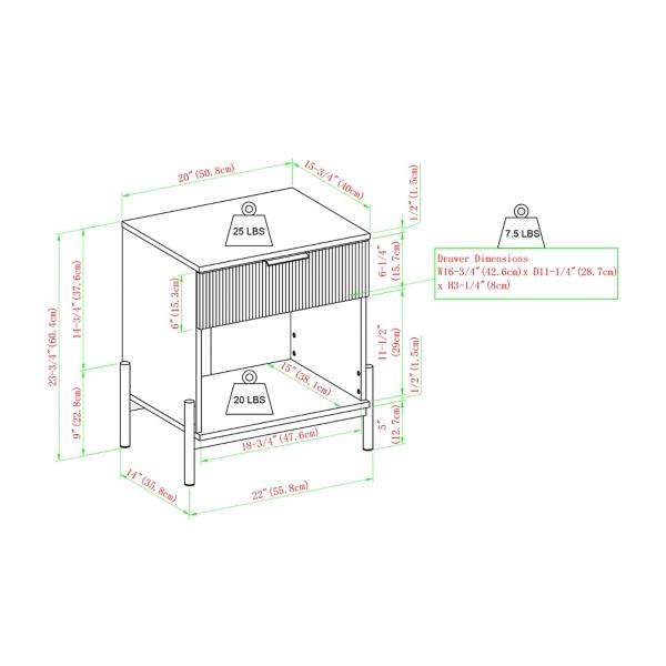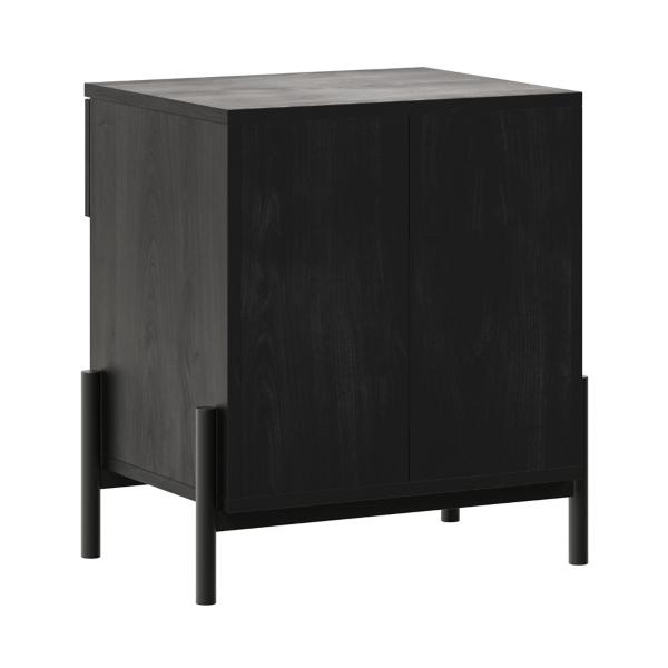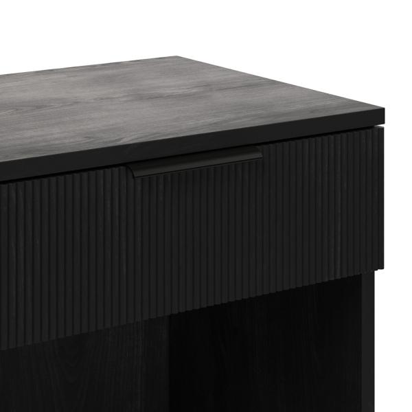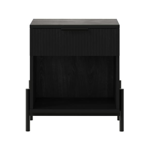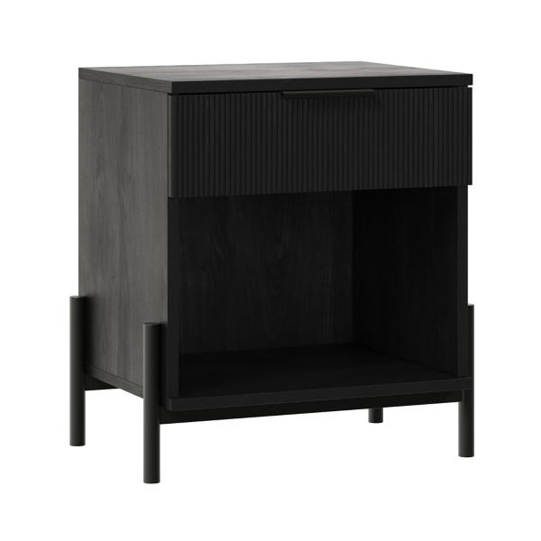 The Black Reeded Drawer Nightstand adds a touch of texture to your bedroom. Use the reeded drawer to store chargers, lip balm, and other bedside essentials. The spacious cubby can host a collection of your favorite books, or even a display of your most recent travel souvenirs. Nightstand measures 22L x 15.75W x 24H in. Crafted of wood composite and laminate Black finish Black metal legs Reeded drawer front Features one (1) drawer for closed storage and open cubby storage space Top weight capacity: 25 lbs. Cubby weight capacity: 20 lbs. Assembly required; see Info & Guides below to view or print assembly instructions Not intended for commercial use Care: Dust with a soft, dry cloth. This item is available at Kirklands.com only, not available in stores. Please note: this item cannot be shipped to APO/FPO addresses. WARNING: Cancer and Reproductive Harm - For more information go to www.P65Warnings.ca.gov.