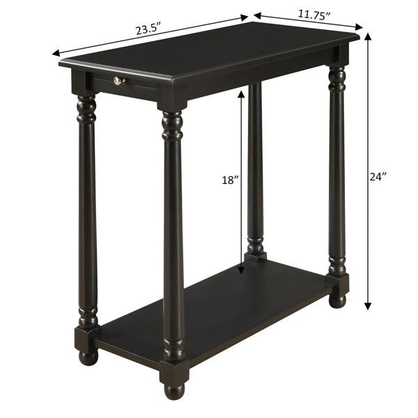 With a sturdy construction and a classically simple design, this Black Regent Wood Accent Table will be the perfect addition to your space. Its pull-out shelf offers convenient, extra surface space whenever needed! Table measures 11.75L x 23.5W x 24H in. Crafted of wood composite Black finish Features one (1) pull-out shelf and one (1) lower shelf Weight: 17 lbs. Shelf weight capacity: 20 lbs. Assembly required Not intended for commercial use Care: Dust with a soft, dry cloth. This item is available at Kirklands.com only, not available in stores. Please note: this item cannot be shipped to APO/FPO addresses.