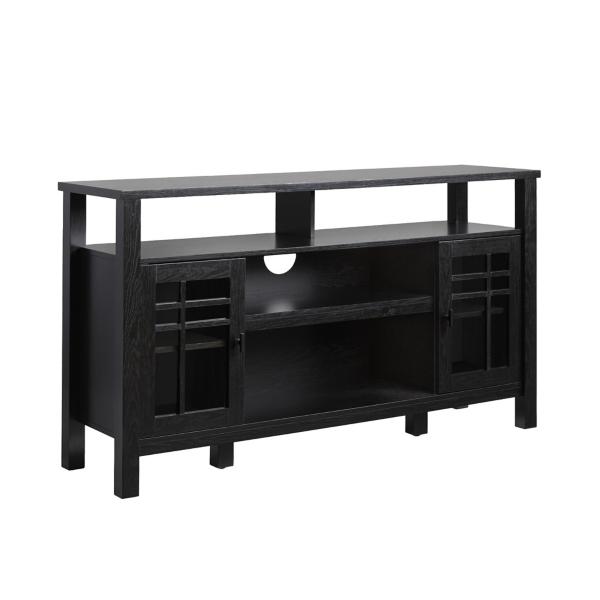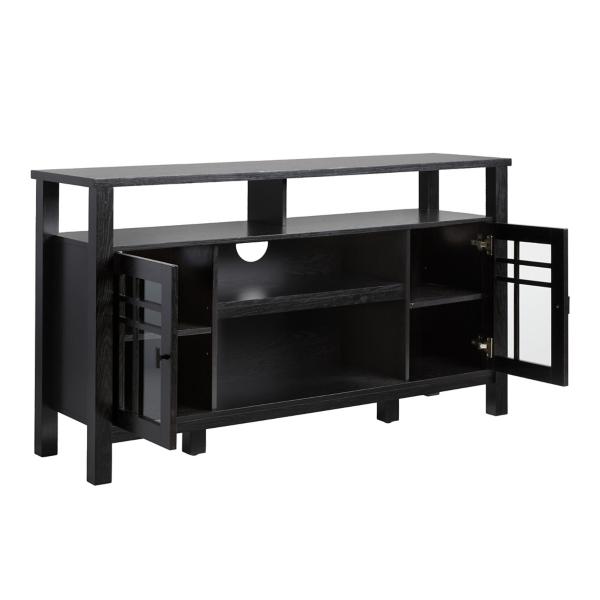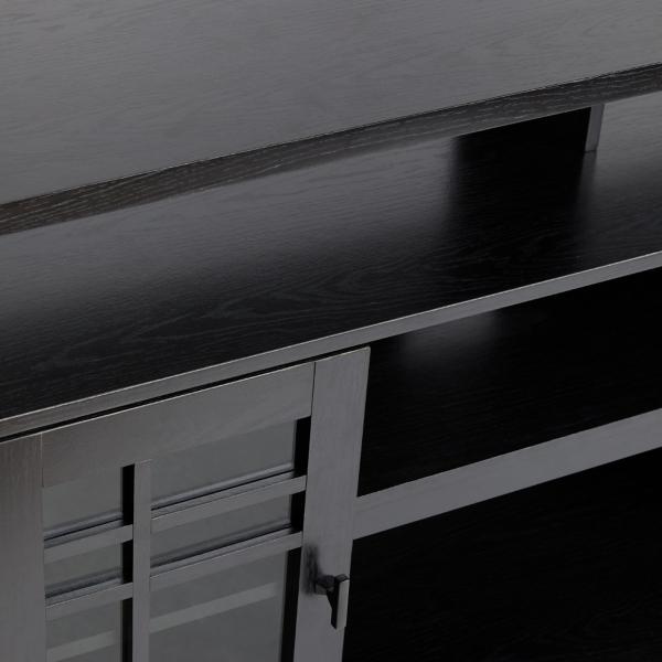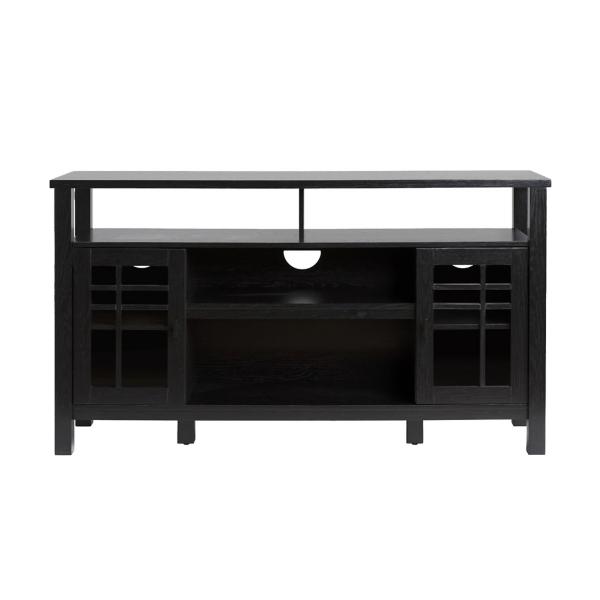 This Black Transitional 2-Door Sideboard TV Stand is a versatile and stylish storage solution for any room in your home! Perfect for anything from dishes to books, this sideboard will upgrade your space. TV stand measures 58W x 15.75D x 32H in. Crafted of warp-resistant MDF, laminate, and glass Black finish Features two windowpane glass doors and open storage space Cut-outs for cord management Middle shelves measure 26.75W x 13.25D x 6.63H in. Interior shelves measure 12.5W x 13.25D x 9H in. Weight: 93 lbs. Weight capacity: 60 lbs. Assembly required; see Info & Guides in the drop down below to view or print assembly info Not intended for commercial use Care: Wipe with a soft, dry cloth. This item is available at Kirklands.com only, not available in stores. Please note: this item cannot be shipped to APO/FPO addresses.