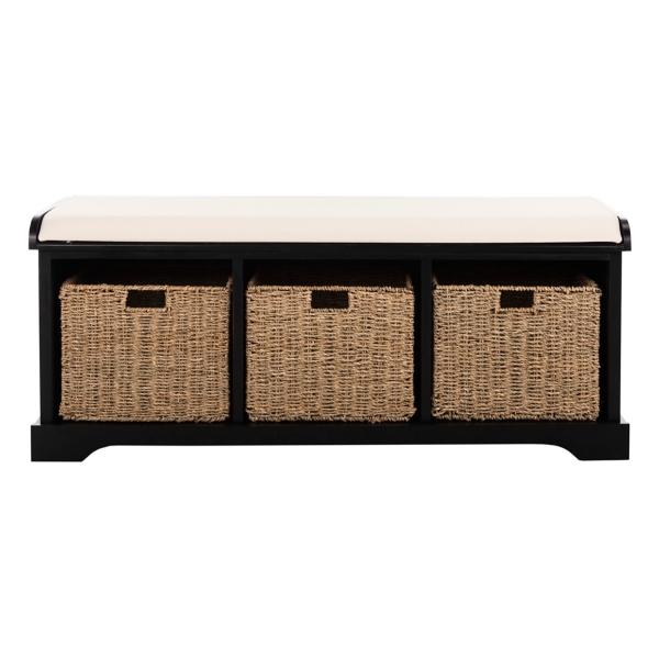 The Black Upholstered Jeanette Storage Bench is the perfect perch for an entryway or mudroom. Its three removable woven baskets provide no-fuss storage, and a white cotton cushion completes the look with comfort and farmhouse charm. Bench measures 47W x 16D x 20H in. Crafted of pine wood, MDF, and wood veneer Black finish Features a white cotton seat cushion filled with high-density foam Includes three (3) wicker storage baskets Cubbies measure 14W x 14.5D x 13H in. Weight: 48 lbs. Weight capacity: 175 lbs. Assembly required; see Info & Guides in the drop down below to view or print assembly info Not intended for commercial use Care: Spot clean. This item is available at Kirklands.com only, not available in stores. Please note: this item cannot be shipped to APO/FPO addresses.