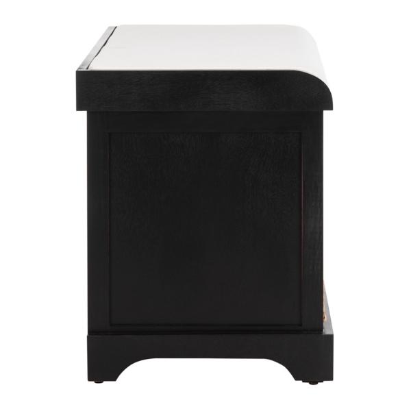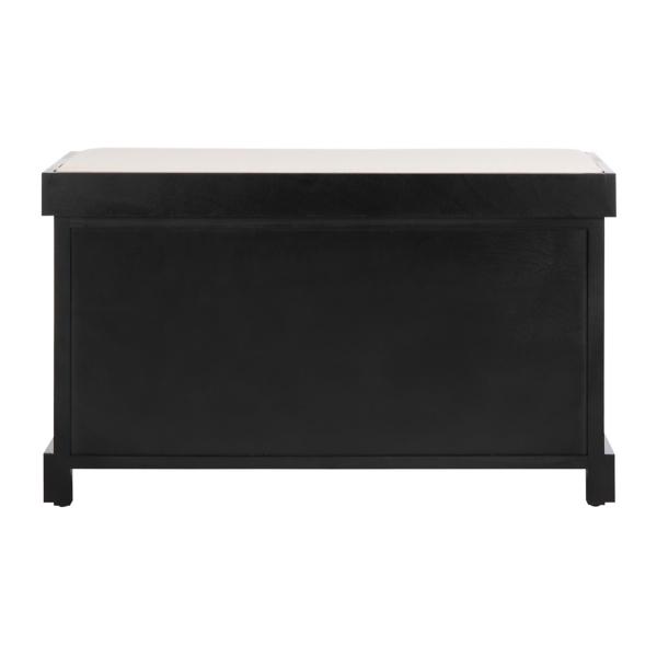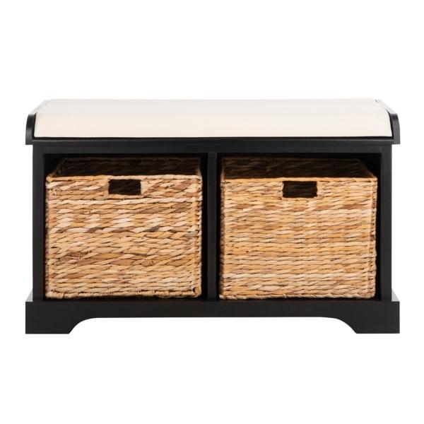 This Black Upholstered Louella Storage Bench is a versatile addition to any room! Perfect for changing shoes in an entryway or storing towels in a bathroom, its woven baskets keep your house neat and tidy with a stylish touch. Bench measures 33.5W x 16.1D x 19.9H in. Crafted of pine and MDF Black finish Features a white canvas seat cushion filled with high-density foam fill Includes two (2) woven storage baskets Weight: 35 lbs. Weight capacity: 300 lbs. No assembly required Not intended for commercial use Care: Spot clean. This item is available at Kirklands.com only, not available in stores. Please note: this item cannot be shipped to APO/FPO addresses.