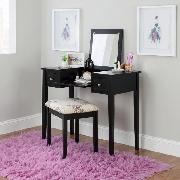 Constructed of solid wood, this Black Virginia Butterfly Vanity Set includes a matching stool upholstered with a unique butterfly print on linen fabric. With two drawers and a lift top mirror, you’ll find ample storage for beauty supplies! Set includes one (1) vanity and one (1) stool Vanity measures 36W x 18D x 30H in. Stool measures 18W x 14.5D x 18.5H in. Crafted of wood Black finish Stool upholstered in beige butterfly print fabric with high-density foam Features a flip top mirror and two (2) drawers Equipped with a cord management port Flip down front panel Weight: 45.5 lbs. Weight capacity (stool): 275 lbs. Weight capacity (vanity): 100 lbs. Assembly required Not intended for commercial use Care: Wipe with a soft, dry cloth. This item is available at Kirklands.com only, not available in stores. Please note: this item cannot be shipped to APO/FPO addresses. WARNING: Cancer and Reproductive Harm - For more information go to www.P65Warnings.ca.gov.
