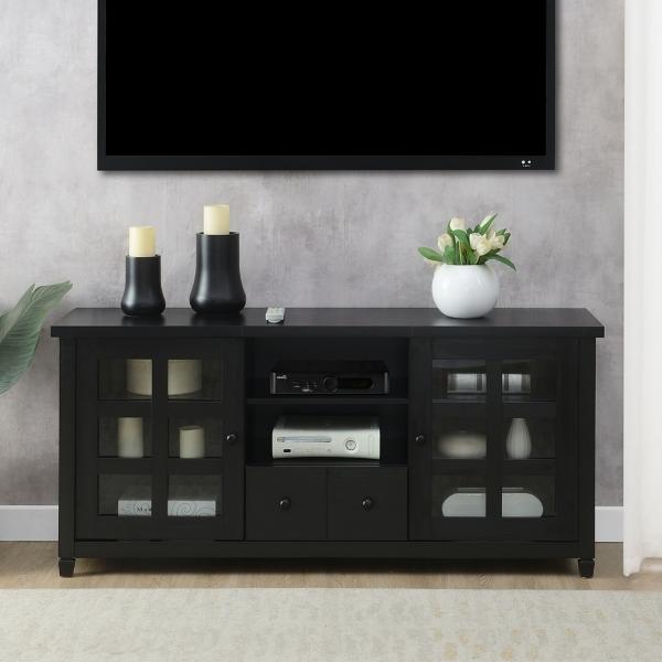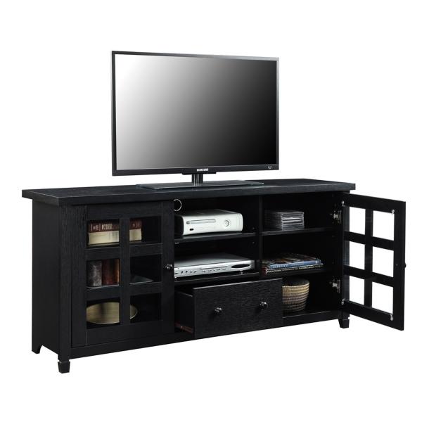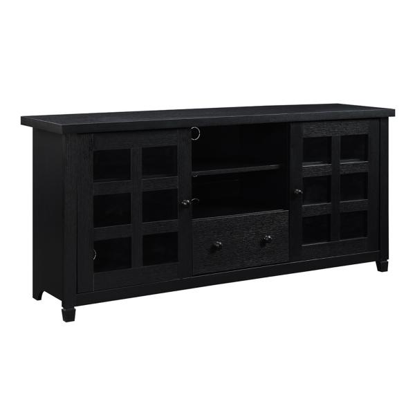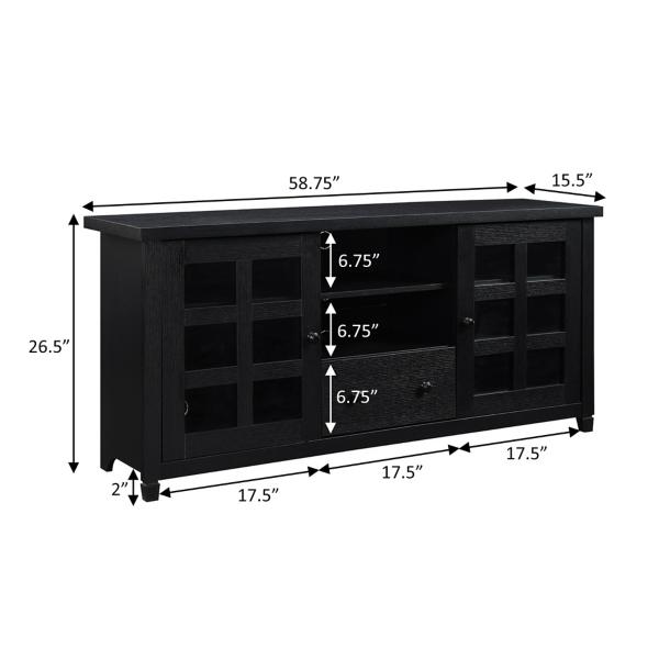 You'll love the sophisticated look of this Black Wood 2-Door Windowpane Media Cabinet! The glass doors are perfect for showcasing décor. The storage space will keep your space organized with a stylish touch! Cabinet measures 58.75W x 15.5D x 26.5H in. Crafted of manufactured wood and tempered glass Black finish Features two (2) glass doors with windowpane designs Features one (1) pull-out drawer Includes two cable management holes Weight: 104 lbs. Weight capacity: 100 lbs. Assembly required Not intended for commercial use Care: Dust with a soft, dry cloth. This item is available at Kirklands.com only, not available in stores. Please note: this item cannot be shipped to APO/FPO addresses.