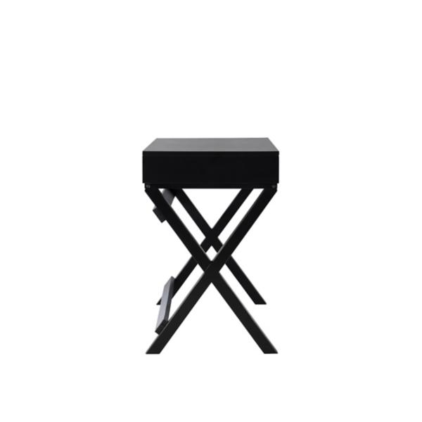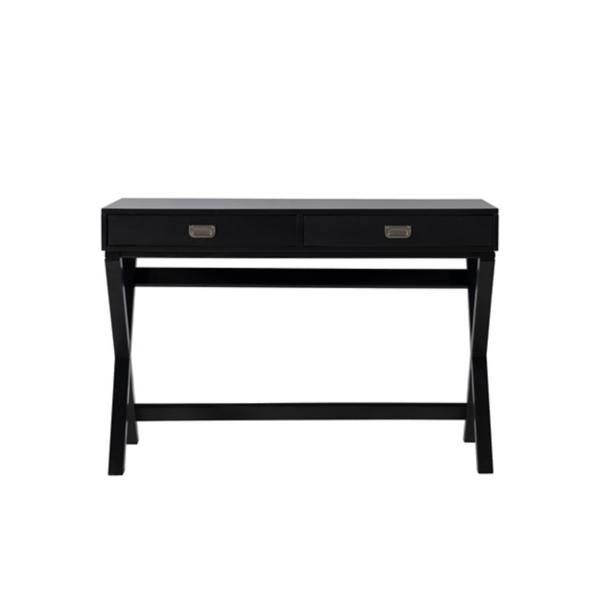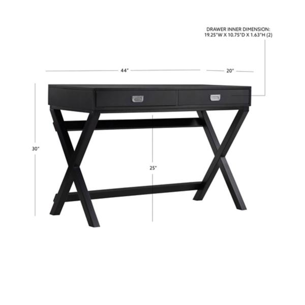 Make work fun with this campaign-style Black Wood 2-Drawer Peggy Desk! The x-framed legs provide a study foundation for your workspace and two drawers provide ample space for supplies. Desk measures 44W x 20D x 30H in. Crafted of wood Black finish Features sturdy x-frame legs Two drawers with metal glides Shiny silver hardware Drawers interiors measure 19W x 10.8D x 1.6H in. Weight: 46.3 lbs. Weight capacity: 100 lbs. Assembly required Not intended for commercial use Care: Dust with a soft, dry cloth. This item is available at Kirklands.com only, not available in stores. Please note: this item cannot be shipped to APO/FPO addresses.