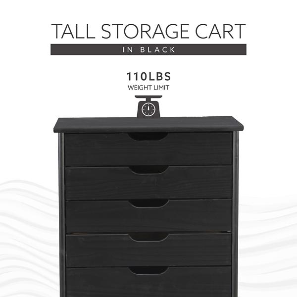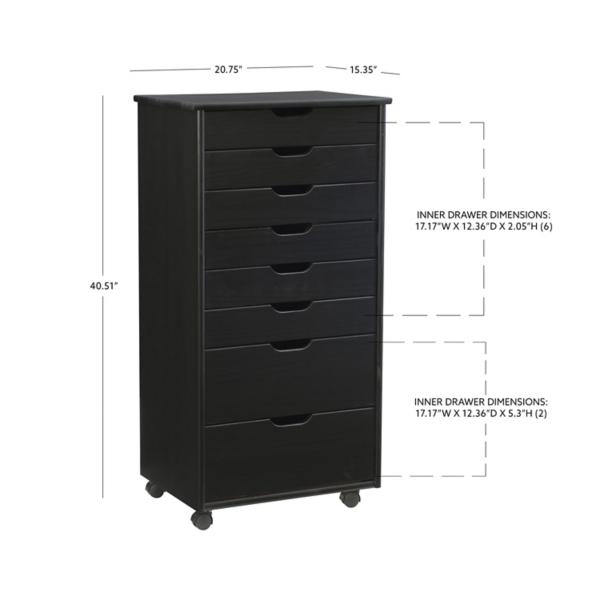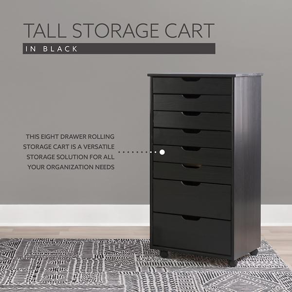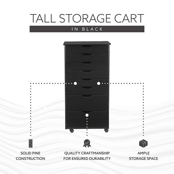 This Black Wood 8-Drawer Cary Storage Cart is a versatile storage solution for your office, kitchen, bedroom, or anywhere organization is needed! With six tray drawers, two deep drawers, and an ample top, this cart can go next to a desk or craft table to keep your items within reach. Cart measures 20.75W x 15.35D x 40.51H in. Crafted of pine wood Black finish Features eight (8) drawers Smooth contoured handle cut outs Drawers can be removed and used as trays Top six drawers measure 17.2W x 12.4D x 2.1H in. Bottom two drawers measure 17.2W x 12.4D x 5.3H in. Caster wheels Weight: 48.7 lbs. Weight capacity: 110 lbs. Assembly required Not intended for commercial use Care: Dust with a soft, dry cloth. This item is available at Kirklands.com only, not available in stores. Please note: this item cannot be shipped to APO/FPO addresses.