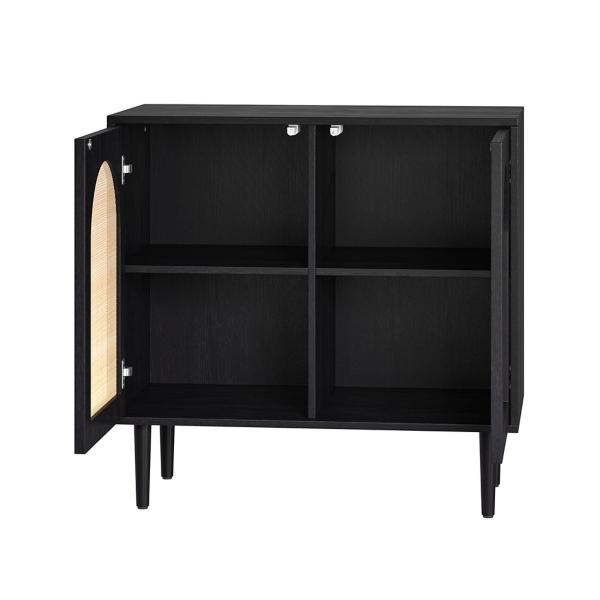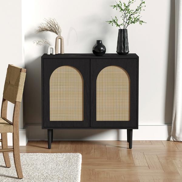 Keep your clutter a secret and let your modern-organic style shine! The Black Wood and Arched Rattan 2-Door Cabinet features a two tone finish and simple silhouette, taking inspiration from mid-century modern design. Cabinet measures 32L x 15.75W x 30.2H in. Crafted of solid wood, manufactured wood, and rattan Black wood frame finish Natural rattan finish Arched rattan door fronts Features two (2) interior shelves Assembly required Not intended for commercial use Care: Dust with a soft, dry cloth. This item is available at Kirklands.com only, not available in stores. Please note: this item cannot be shipped to APO/FPO addresses.