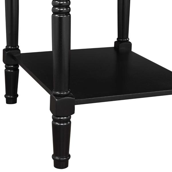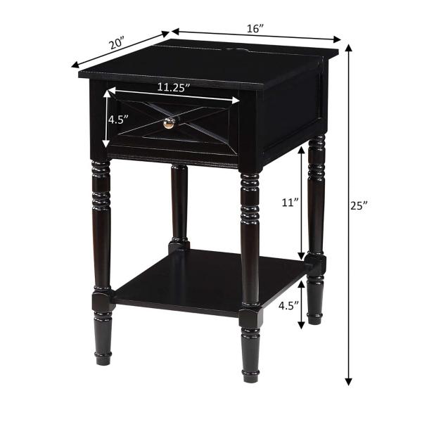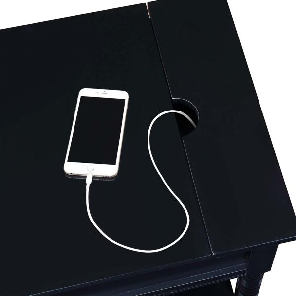 Featuring a traditional design with modern features, this Black Wood Charging Traditional Accent Table is the perfect addition to your space! You'll love the farmhouse details and concealed charging station in your living room or bedroom. Accent table measures 16W x 20D x 25H in. Crafted of solid wood and manufactured wood Black wood finish Nickel hardware finish Features two (2) USB and two (2) standard plug outlets Turned leg design One drawer and one shelf Includes 6 ft. power supply cord Weight: 25 lbs. Weight capacity: 40 lbs. Assembly required Not intended for commercial use Care: Wipe with a soft, dry cloth. This item is available at Kirklands.com only, not available in stores. Please note: this item cannot be shipped to APO/FPO addresses.
