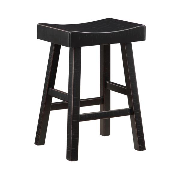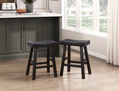 Our Black Wood Counter Stool Set is perfect for your modern home! These transitional stools are perfect for your breakfast bar or counter. You’ll love the contemporary and beautiful look of these distressed all black stools! Set includes two (2) stools Each stool measures 17.5L x 15.5W x 25H in. Crafted of wood Distressed black finish Features a saddle seat and backless design Weight capacity: 250 lbs. Assembly required Not intended for commercial use Care: Wipe clean. This item is available at Kirklands.com only, not available in stores. Please note: this item cannot be shipped to APO/FPO addresses.