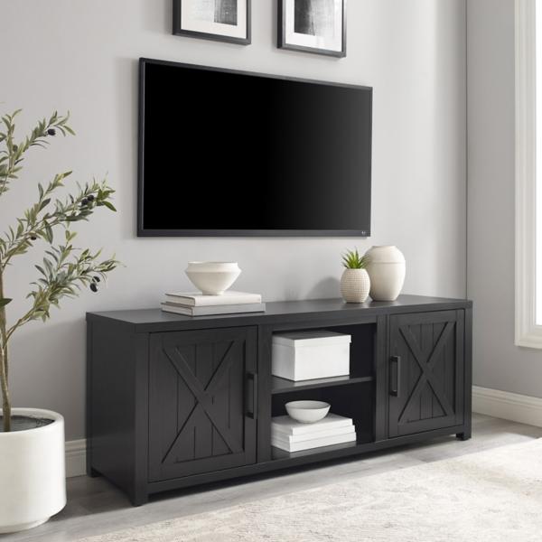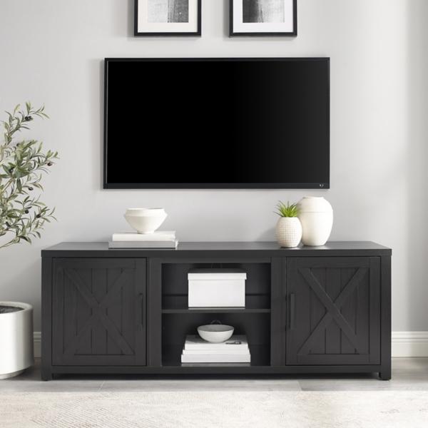 Complete your living room or den with this Black Wood Farmhouse Media Cabinet. Its updated rustic style will give your space a classic, yet chic look! Plus its ample storage space and cable management holes are perfect for all your entertainment accessories! Cabinet measures 58L x 15.75W x 22H in. Crafted of wood Black finish Features two (2) barn-style doors and four (4) interior shelves Center features open storage with a removable shelf Includes two (2) cable management holes Shelf weight capacity: 15 lbs. Black metal hardware Assembly required Not intended for commercial use Care: Dust with a soft, dry cloth. This item is available at Kirklands.com only, not available in stores. Please note: this item cannot be shipped to APO/FPO addresses. WARNING: This product can expose you to chemicals including wood dust and lead which is known to the state of California to cause cancer and birth defects or other reproductive harm. For more information go to www.P65Warnings.ca.gov.