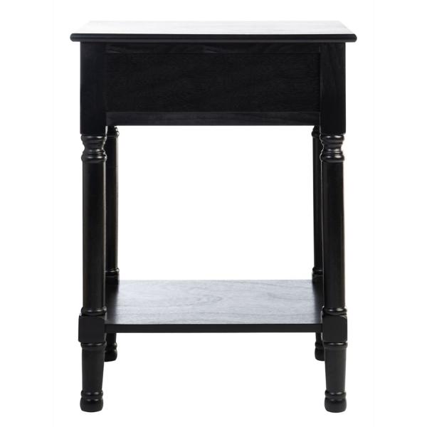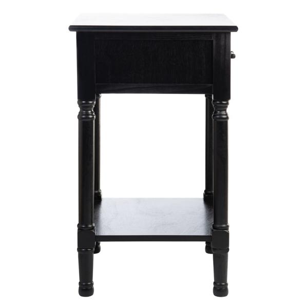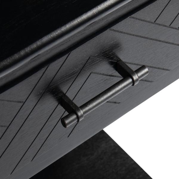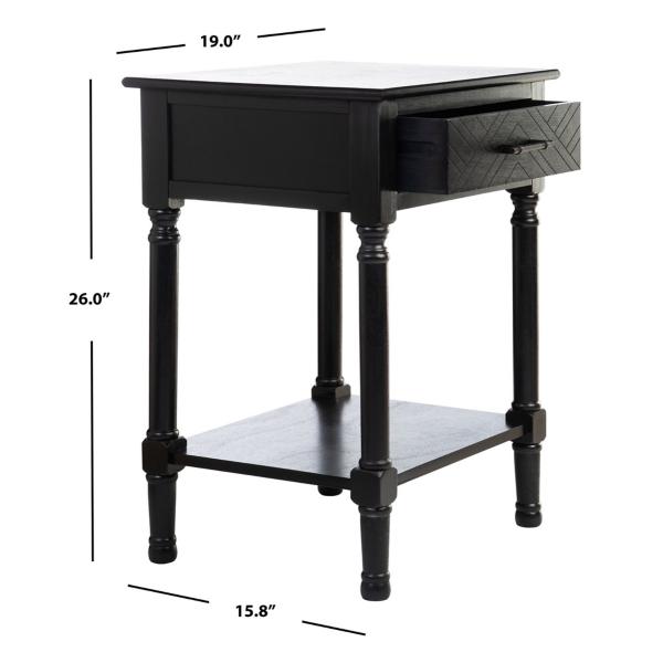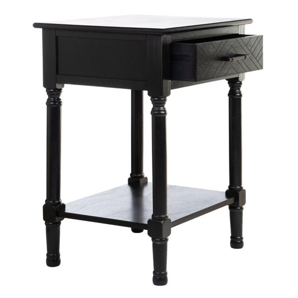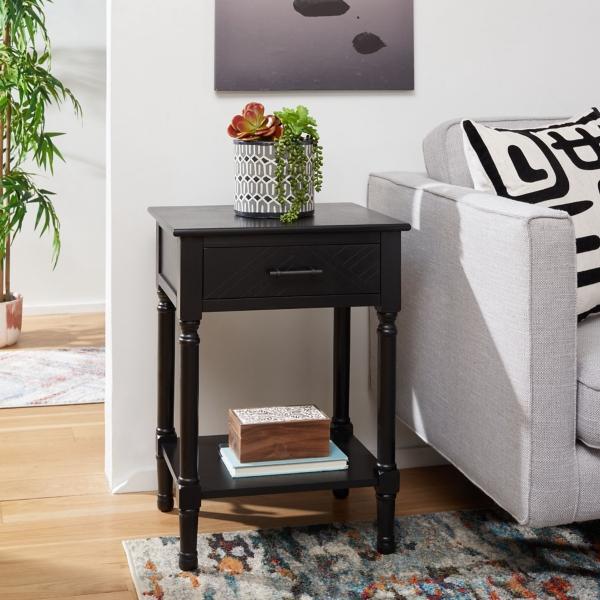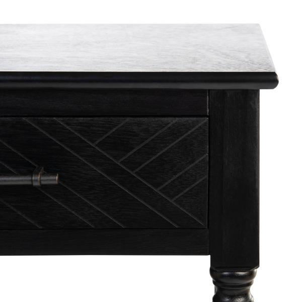 Understated yet sophisticated, this Black Wood Peyton 1-Drawer End Table is ideal for today’s classic contemporary décor! Timeless turned legs and carved wooden accents get a modern touch with its herringbone pattern drawer. End table measures 19W x 15.8D x 26H in. Crafted of pine wood and MDF Black finish Features one (1) drawer and one (1) lower shelf Accented with a herringbone pattern on drawer Antique black metal drawer pull Drawer measures 13.3W x 10.2D x 3.6H in. Shelf measures 14.3W x 11.2D x 12.4H in. Weight: 17.6 lbs. Weight capacity: 40 lbs. Assembly required; see Info & Guides in the drop down below to view or print assembly info Not intended for commercial use Care: Wipe with a soft, dry cloth. This item is available at Kirklands.com only, not available in stores. Please note: this item cannot be shipped to APO/FPO addresses.
