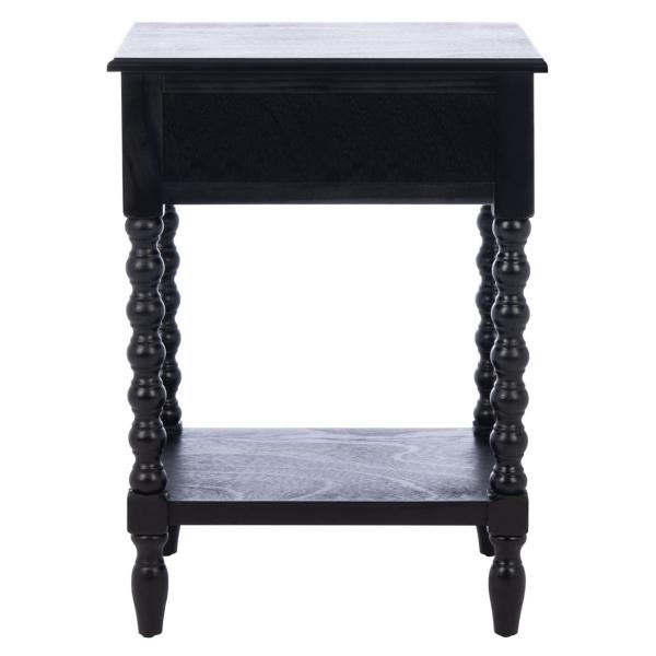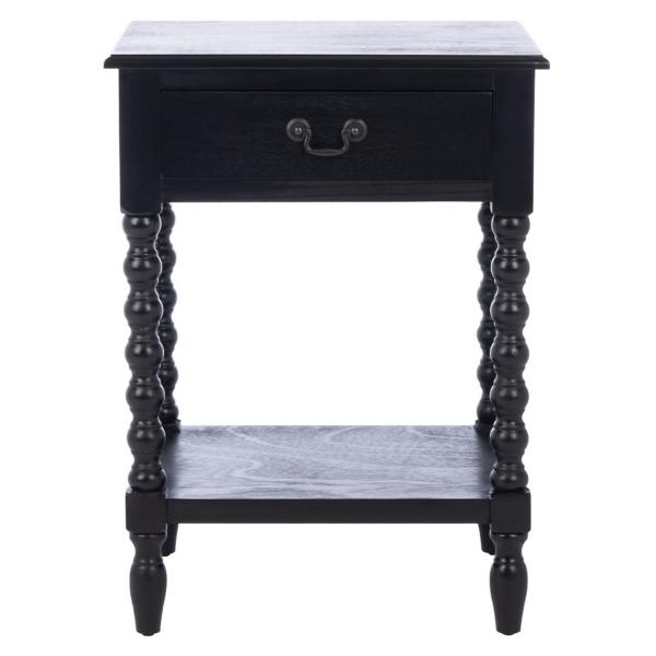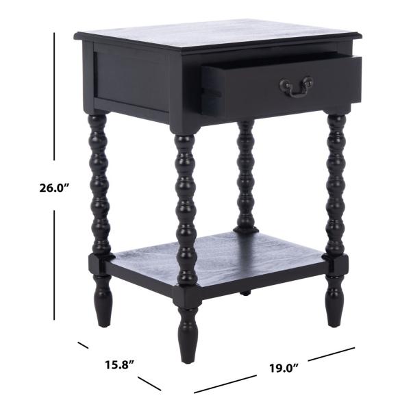 Classic farmhouse charm meets contemporary style in this Black Wood Phoebe End Table! This table's modernized ball-turned legs are beautifully highlighted by its bold black finish, while an open bottom shelf and slim drawer provide ample storage and display space. Table measures 19W x 15.8D x 26H in. Crafted of pine wood and MDF Black finish Features one (1) drawer and one (1) lower shelf Ball-turned legs Black drawer pull finish Drawer measures 12.5W x 9D x 3.5H in. Shelf measures 14.3W x 11.2D x 12.5H in. Weight: 17.6 lbs. Weight capacity: 40 lbs. Assembly required; see Info & Guides in the drop down below to view or print assembly info Not intended for commercial use Care: Wipe with a soft, dry cloth. This item is available at Kirklands.com only, not available in stores. Please note: this item cannot be shipped to APO/FPO addresses.