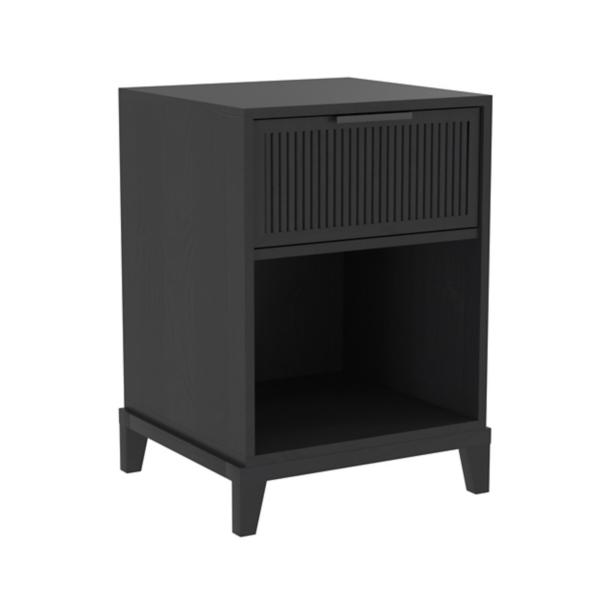 Store in style with this Black Wood Reeded Storage Nightstand! Its reeded drawer front, sleek metal hardware, and minimalist design come together to lend this piece a modern aesthetic. Nightstand measures 16.75W x 15.88D x 24.68H in. Crafted of solid pine wood Black finish Features one (1) drawer and one (1) open cubby Reeded drawer front design Weight: 20 lbs. Assembly required; see Info & Guides in the drop down below to view or print assembly info Not intended for commercial use Care: Wipe with a soft, dry cloth. This item is available at Kirklands.com only, not available in stores. Please note: this item cannot be shipped to APO/FPO addresses.