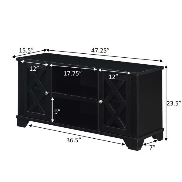This Black Wood X Doors Media Cabinet offers storage space with a stylish look to elevate your space! Perfect for keeping your living space organized, this cabinet gives you a durable, affordable, and modern storage solution! Cabinet measures 47.25W x 15.5D x 23.5H in. Crafted of MDF with a melamine veneer Black finish Features two (2) doors with X designs Features two (2) open shelves and four (4) enclosed shelves Includes two cable management holes Weight: 60 lbs. Weight capacity: 100 lbs. Assembly required Not intended for commercial use Care: Dust with a soft, dry cloth. This item is available at Kirklands.com only, not available in stores. Please note: this item cannot be shipped to APO/FPO addresses.