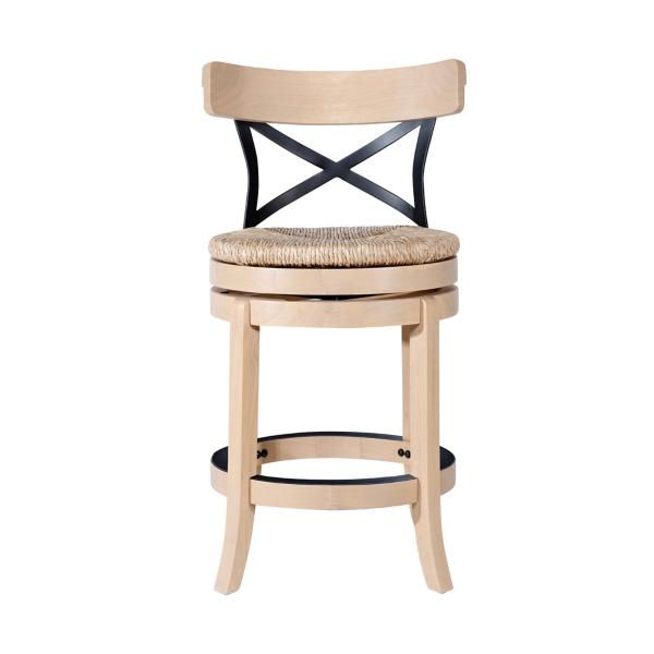 Add a touch of modern farmhouse charm to your kitchen with this Blonde Oak Myrtle Swivel Counter Stool! With a blend of contemporary black metal accents and natural materials, you'll love how it elevates your space. Counter stool measures 22.75W x 22.75D x 37H in.; seat height: 24 in. Crafted with a wood frame Natural finish Features 360 degree swivel capability Woven sedge grass seat Black metal X-back design Built-in footrest and protective kick plate Weight capacity: 300 lbs Assembly required Not intended for commercial use Care: Wipe with a soft, dry cloth. This item is available at Kirklands.com only, not available in stores. Please note: this item cannot be shipped to APO/FPO addresses.