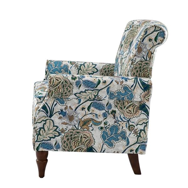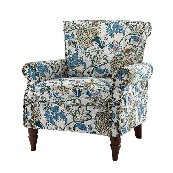 Bring bold, elegant character into your space with this Blue and Green Floral Upholstered Accent Chair. With its botanical design and classic silhouette, it makes a beautiful statement piece! Chair measures 30L x 31W x 32.5H in.; seat measures 18.5H in. Crafted of polyester, wood, and metal High-density foam fill Upholstered in a polyester fabric with floral print Brown wood leg finish Features a floral print design Hues of blue, green, white, gray, and tan Accented with nailhead trim Weight capacity: 220 lbs. Some assembly required Not intended for commercial use Care: Dust with a soft, dry cloth. This item is available at Kirklands.com only, not available in stores. Please note: this item cannot be shipped to APO/FPO addresses.