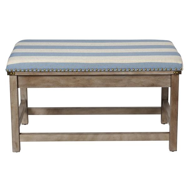 Add some cozy extra seating to your home with this Blue and White Striped Upholstered Wood Bench. Featuring light hues and a weathered wood finish, this bench will make the perfect addition to rustic, farmhouse, or coastal decor! Bench measures 35.5L x 15.5W x 20H in. Crafted with a wood composite frame Barnwood frame finish Upholstered in linen fabric with foam fill Seat features a blue and white striped pattern Features bronze nailhead trim Weight capacity: 250 lbs. Assembly required Not intended for commercial use Care: Dust with a soft, dry cloth. This item is available at Kirklands.com only, not available in stores. Please note: this item cannot be shipped to APO/FPO addresses. WARNING: Cancer and Reproductive Harm - For more information go to www.P65Warnings.ca.gov.