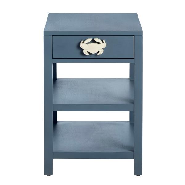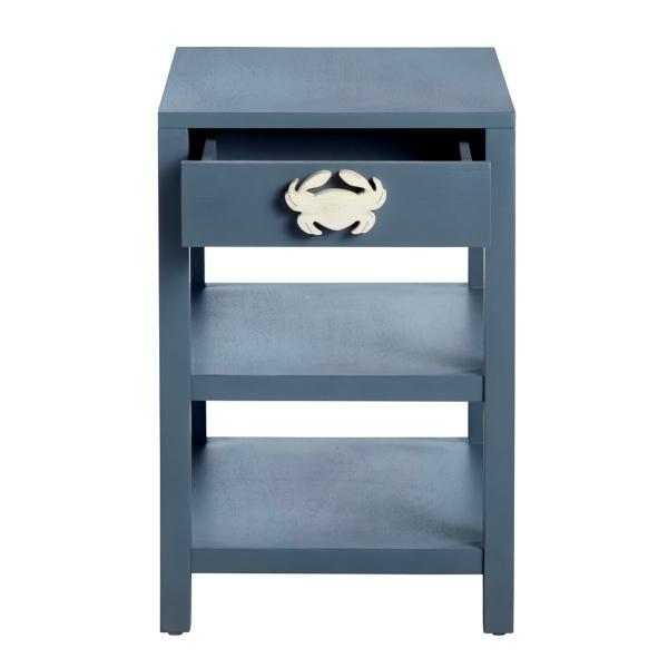 Complete your coastal cottage living room with the Blue Crab Accent Table. The deep blue finish adds a splash of color while the open shelves provide space for your beach-inspired décor! Table measures 16L x 23W x 24H in. Crafted of wood composite Blue finish Accented with carved crab designs Features one (1) drawer and two (2) shelves Rectangular shape Hues of blue and white Weight: 25 lbs. No assembly required Not intended for commercial use Care: Dust with a soft, dry cloth. This item is available at Kirklands.com only, not available in stores. Please note: this item cannot be shipped to APO/FPO addresses. WARNING: Cancer and Reproductive Harm - For more information go to www.P65Warnings.ca.gov.